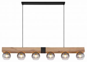 Diese wunderschöne Deckenlampe aus der MOITAS-Serie inspiriert mit einem großartigen Design. Von einer rechteckigen schwarzen Deckenmontage ragen zwei schwarze Kabel mit einer Länge von 1,2 m bis zu einem Block in Holzoptik (140×15 cm). Es gibt sechs E27-Fassungen, jeweils mit einem Glaskuppel in Rauchfarben. Mit den E27-Anschlüssen können Sie selbst über Lichtfarbe und Helligkeit bis zu einer maximalen Leistung von 40 Watt entscheiden.