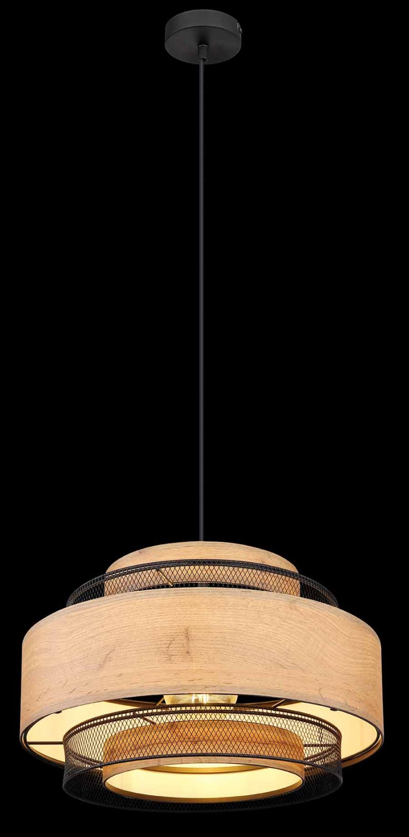 <p Diese großartige Pendelleuchte inspiriert mit ihrem schlichten Design. Eine E27-Fassung hängt an einem schwarzen Kabel, das bis zu 1,2 m von der Decke reicht. Die E27-Fassung ist mit einem wunderschönen Schirm aus Metallgittern und Holzoptik-Dekorationen (Ø45cm) ausgestattet. Damit können Sie die Lichtfarbe und Helligkeit bis zu einer maximalen Leistung von 60 Watt bestimmen.