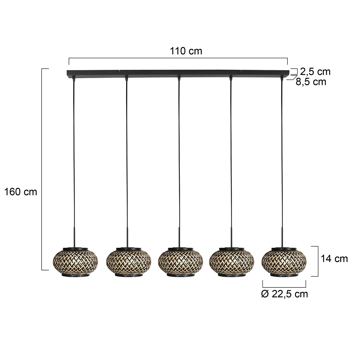 Diese längliche schwarze Hängeleuchte mit fünf Lichtpunkten wird hier mit fünf kompakten Bambuskappen kombiniert und eignet sich hervorragend über einem Esstisch oder Kochinsel. Die Leuchte hat fünf E27 Fassungen, jeweils an einem stabilen Zwillingskabel mit einer maximalen Länge von etwa 140 Zentimetern. So kannst du die Lichtpunkte gleichmäßig verteilen oder spielerisch in der Höhe variieren. Die längliche Deckenplatte von etwa 110 mal 8,5 Zentimetern wirkt schlicht und modern und lässt sich einfach montieren.