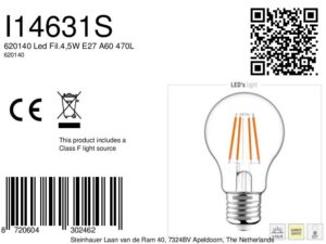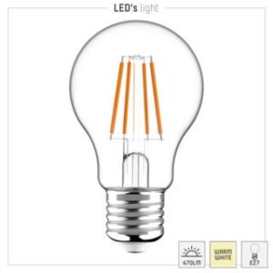 Die Lichtquelle hat eine E27 (große) Fassung. Die Farbtemperatur beträgt 2700 Kelvin mit einer Lichtausbeute von 470 Lumen. Die Filamentlampe ist nicht dimmbar.