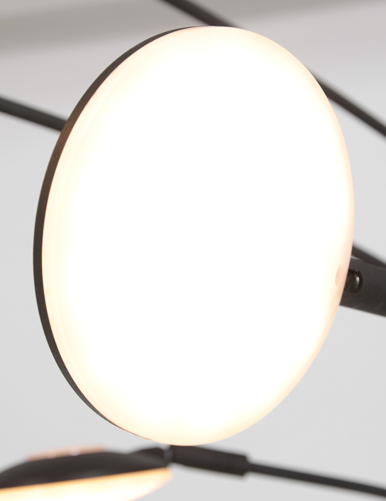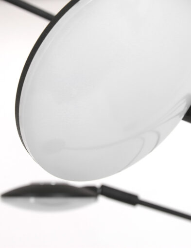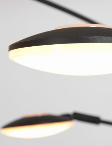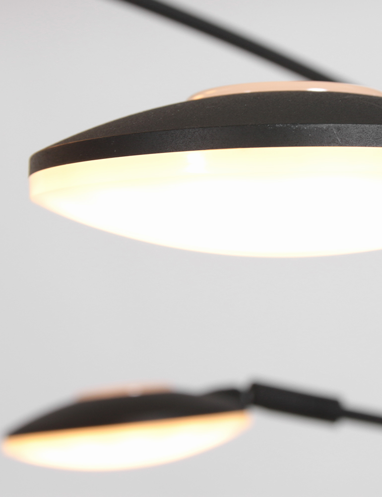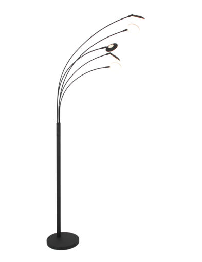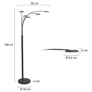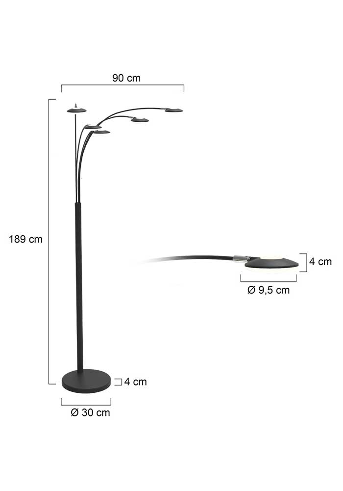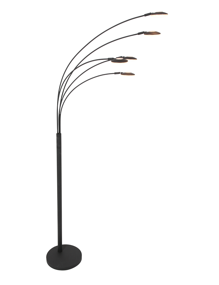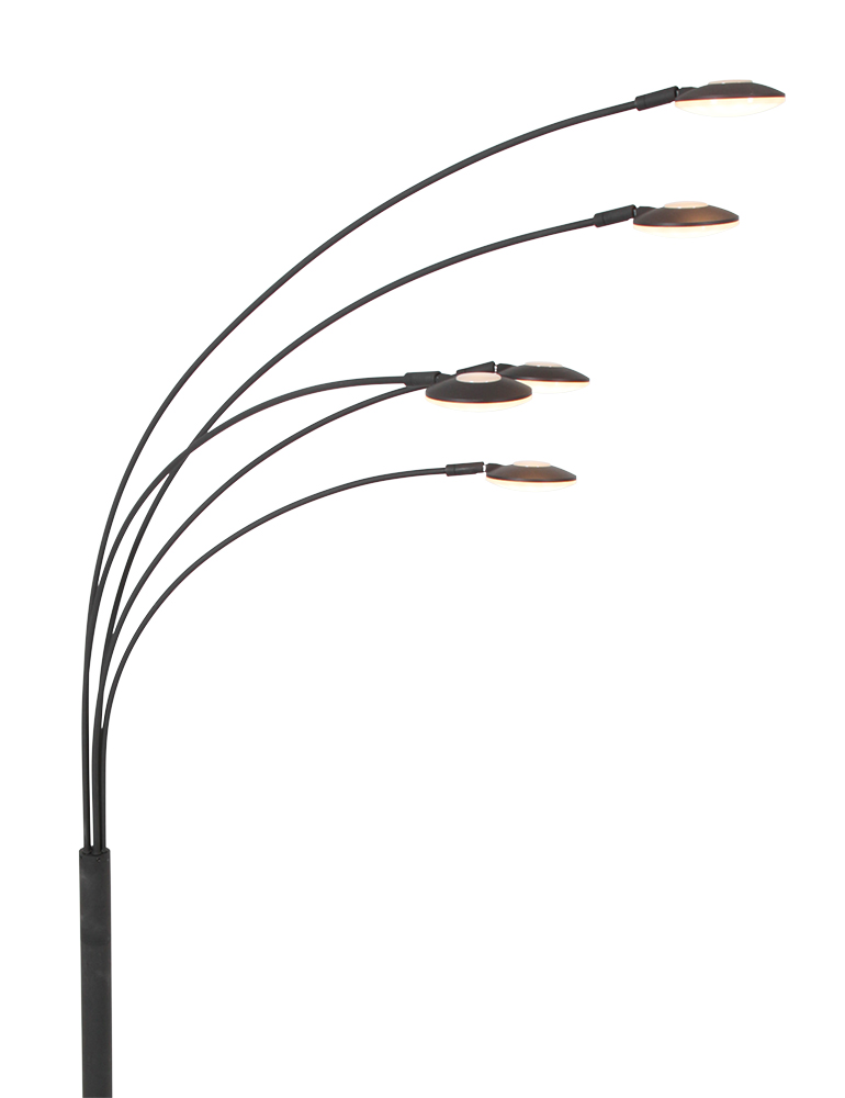 Diese schwarze 5-Lichter Stehlampe aus der Synna-Serie hat ein schlankes und modernes Design. Die Metallbogenlampe hat eine Gesamthöhe von 189 cm und eine Tiefe von 90 cm. Die Schirme mit einem Durchmesser von 9,5 cm sind mit integrierten LED-Lichtquellen von 4,5 Watt ausgestattet, mit einer Farbtemperatur von 2700 Kelvin und einer Lichtausbeute von 500 Lumen pro Schirm. Ausgestattet mit einem Drehdimmer am Fuß und geliefert mit einem 235 cm langen Kabel.