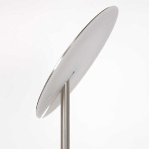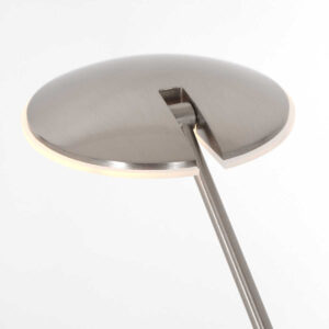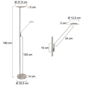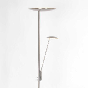 Diese Stehlampe verfügt über eine einstellbare Lichtfarbe zwischen 2700 und 4000 Kelvin und ist mit zwei LED-Modulen ausgestattet: Der verstellbare Arm hat ein 7 Watt LED-Modul mit einer Lichtausbeute von bis zu 700 Lumen, während die Uplight ein leistungsstarkes 33 Watt LED-Modul mit 3300 Lumen enthält. Beide Lichtquellen sind dimmbar und einfach über die integrierte Taste am aufsteigenden Rohr zu bedienen. Die Lampe ist aus mattem gebürstetem Stahl gefertigt und strahlt moderne und zeitlose Eleganz aus.
