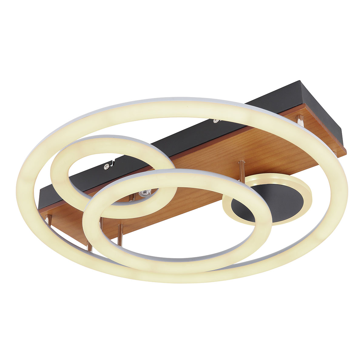Erleben Sie ein bezauberndes Lichterlebnis mit dieser augenfälligen Deckenleuchte, die aus 4 Ringen unterschiedlicher Größe (Ø48cm) besteht und in einer stilvollen Mischung aus Schwarz und Braun erhältlich ist. An einer rechteckigen Deckenhalterung befestigt, kann diese Lampe einfach installiert und mit der mitgelieferten Fernbedienung gedimmt werden, für einen Lichtbereich von gemütlichem 2700 Kelvin warmweiß bis hin zu hellem 6500 Kelvin kaltweiß. Der praktische Speichermechanismus sorgt dafür, dass Ihre zuletzt verwendeten Einstellungen auch nach dem Ausschalten der Lampe erhalten bleiben. Stellen Sie mühelos die ideale Atmosphäre in Ihrem Raum mit dieser vielseitigen Beleuchtungslösung ein.