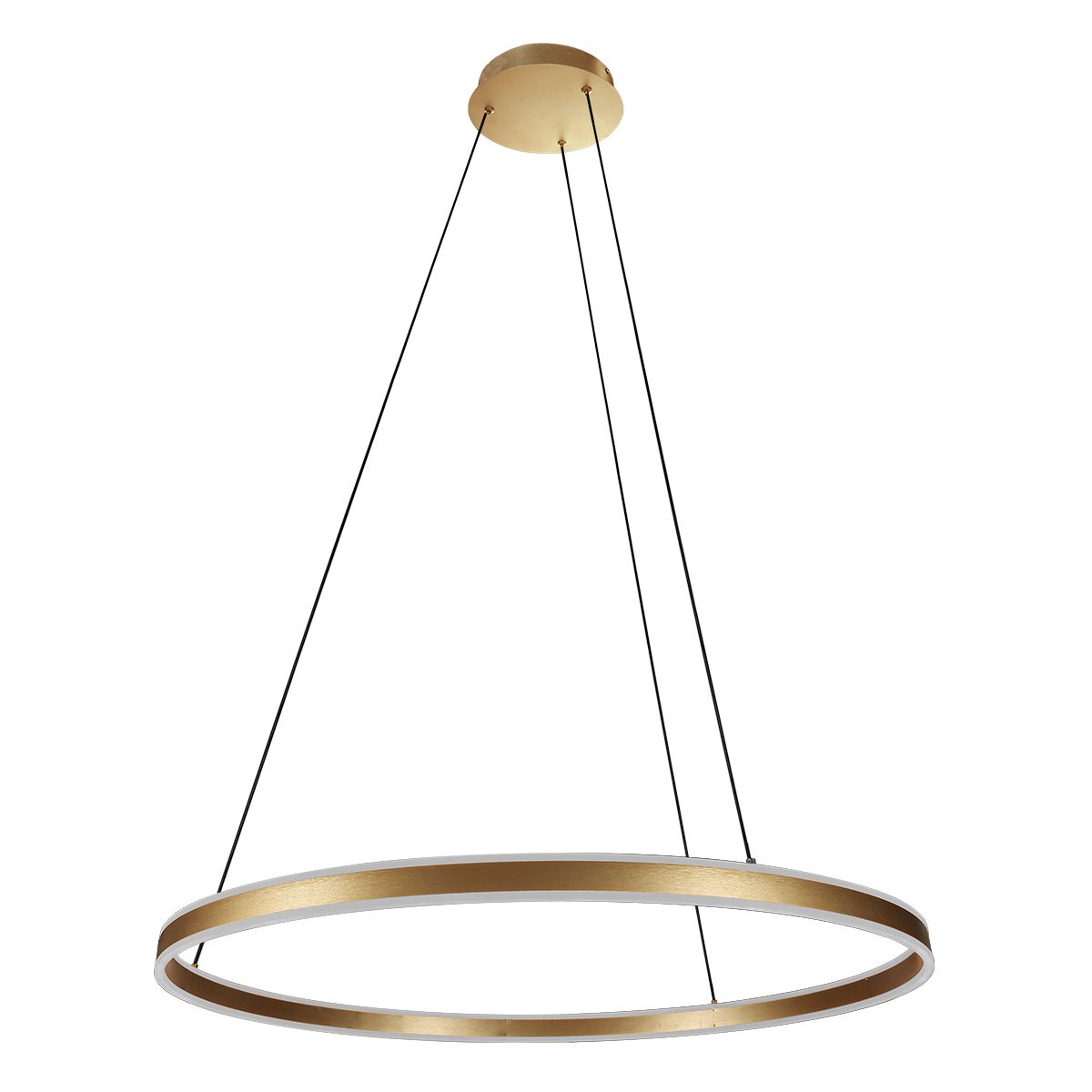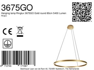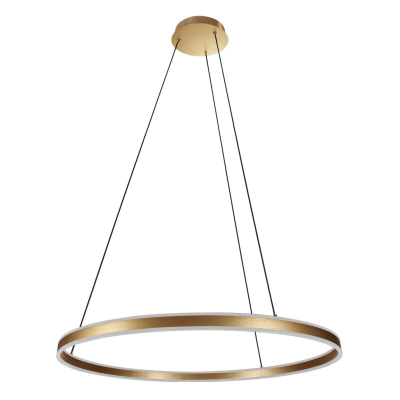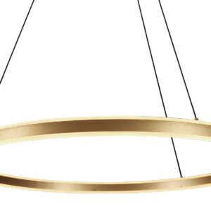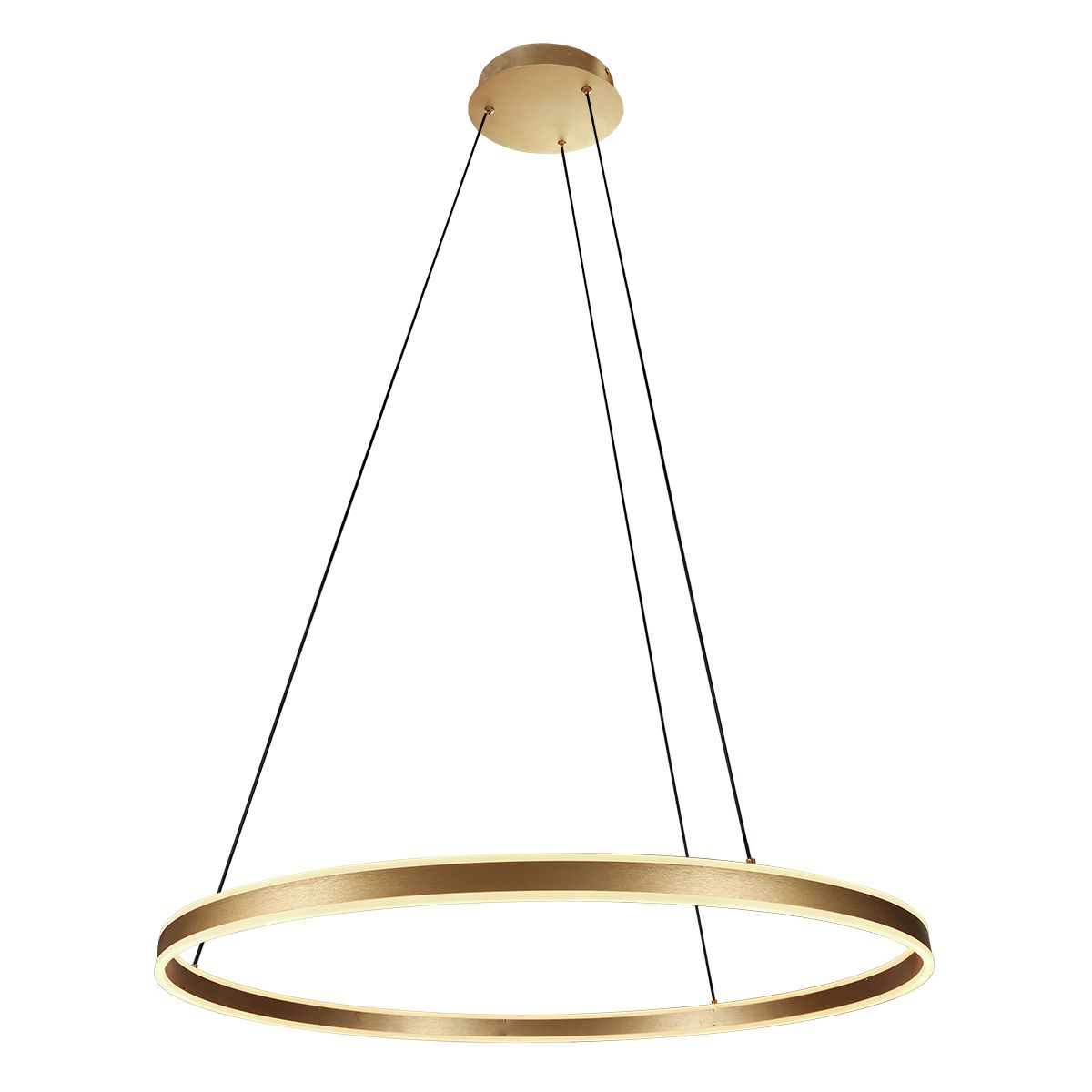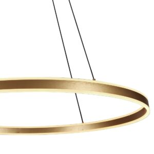 Die goldene Ringlux Hängeleuchte hat einen Durchmesser von 80 cm und ein minimalistisches Design. Die LED-Beleuchtung strahlt warmes Licht mit einer Farbtemperatur von 2700K und einer Lichtausbeute von 5400 Lumen aus. Dimmbar über einen externen Dimmer (2 x 30W) und in der Höhe von 50 bis 190 cm verstellbar. Diese moderne Designlampe wird mit 2 Jahren Herstellergarantie geliefert.