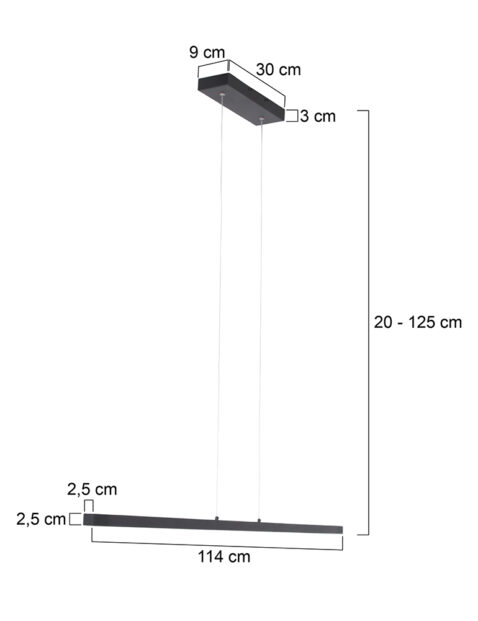 Die Light Stripe Hängeleuchte aus der Danske-Serie ist eine moderne und minimalistische Ergänzung für dein Zuhause. Die Lampe ist mit einem austauschbaren LED-Streifen von 20 Watt ausgestattet, mit einer Lichtfarbe von 2700 Kelvin und einer Lichtausbeute von 2000 Lumen. Die Höhe ist während der Montage von 20 bis 125 cm einstellbar, sodass sie perfekt über einem Esstisch oder Arbeitsplatz passt. Dank des integrierten Dimmers zwischen den Aufhängungskabeln kannst du die Helligkeit ganz einfach an die gewünschte Stimmung anpassen.