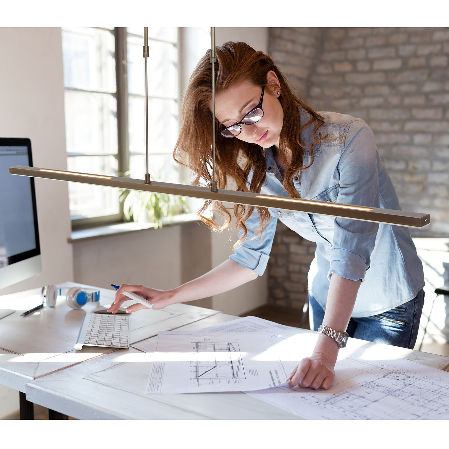 Diese bronzene Hängelampe aus der Zelena-Serie verfügt über drei integrierte LED-Lichtpunkte: zwei an der Oberseite und einen an der Unterseite, was einen einzigartigen Lichteffekt erzeugt. Mit LED-Bändern von 2 x 4 Watt (800 Lumen) und 17 Watt (1700 Lumen) sorgt die Lampe für optimale Beleuchtung. Die Lichtfarbe kann zwischen 2200 und 4000 Kelvin eingestellt werden und ist über die Push-Dimmer an beiden Seiten dimmbar. Während der Montage ist die Höhe von 82 bis 117 cm verstellbar, während das Gehäuse eine Länge von 122 cm und eine Breite von 3 cm hat. Diese Hängelampe der Marke Steinhauer wird mit 2 Jahren Garantie geliefert.