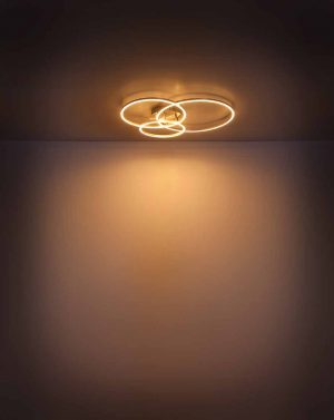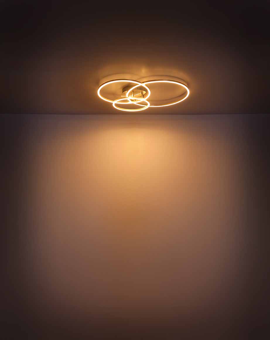 Die MUNNI Deckenlampe, ausgeführt in einem modernen und eleganten Design, präsentiert eine einzigartige Kombination aus drei überlappenden LED-Ringen, die an einem runden Deckenstück befestigt sind. Sie sind aus langlebigem Kunststoff gefertigt und stellen eine auffällige Ergänzung für Räume wie das Schlafzimmer, das Wohnzimmer oder die Diele dar. Das innovative LED-System bietet eine starke Lichtausbeute von 1500 Lumen, während es ein angenehmes warmweißes Licht von 3000K reproduziert. Harmonisch in verschiedene Einrichtungsstile einfügbar, wird diese Leuchte zum Star jedes Raumes und wird inklusive einer energieeffizienten LED-Lampe geliefert.