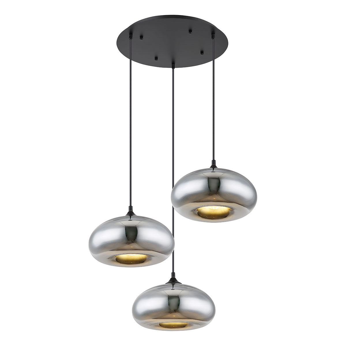 Bereichern Sie Ihr Interieur mit unserer Selly-Serie Hängeleuchte, mit einem Durchmesser von 65 cm. Diese Lampe besteht aus einer runden, schwarzen Metallplatte mit drei schwarzen Kabeln, die in elegant gebogenen, chromen Glastönen enden. Höhenverstellbar bis 150 cm während der Installation. Kombinieren Sie sie mit anderen Artikeln für ein stimmiges Gesamtbild.