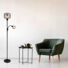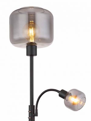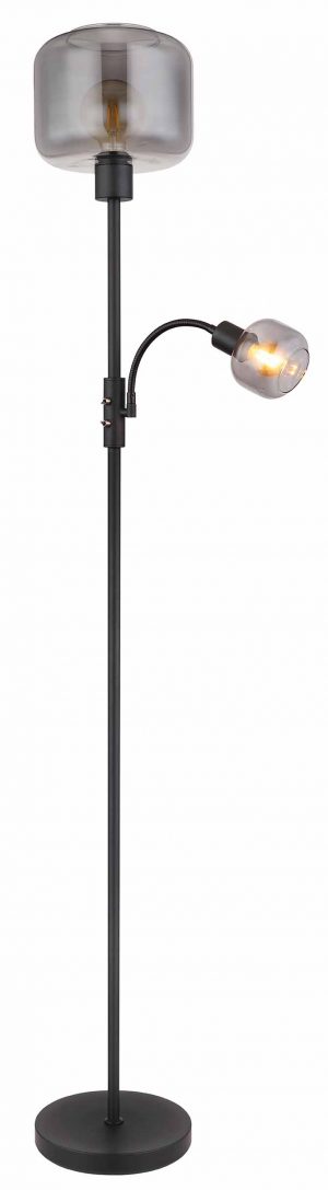 Diese elegante Stehlampe mit einem schwarzen matten Metallstab von 1,6 m und einem runden Fuß verfügt über eine E27- und E14-Anschluss, jeweils mit einem rauchfarbenen Glas-Schirm, sodass Sie die Lichtfarbe und Helligkeit bis zu 40 Watt (E27) und 15 Watt (E14) anpassen können. Es werden LED-Lampen für Nachhaltigkeit und Energieeinsparung empfohlen.