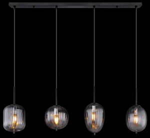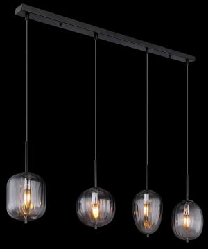Diese Pendelleuchte, mit einer Länge von 1100 mm und einer Breite von 185 mm, ist aus mattem schwarzem Metall und rauchfarbenem Glas gefertigt. Der Durchmesser des Glases variiert von 15,8 cm bis 18,5 cm. Ein modernes und elegantes Beleuchtungselement, das eine angenehme Atmosphäre in jedem Raum schafft.