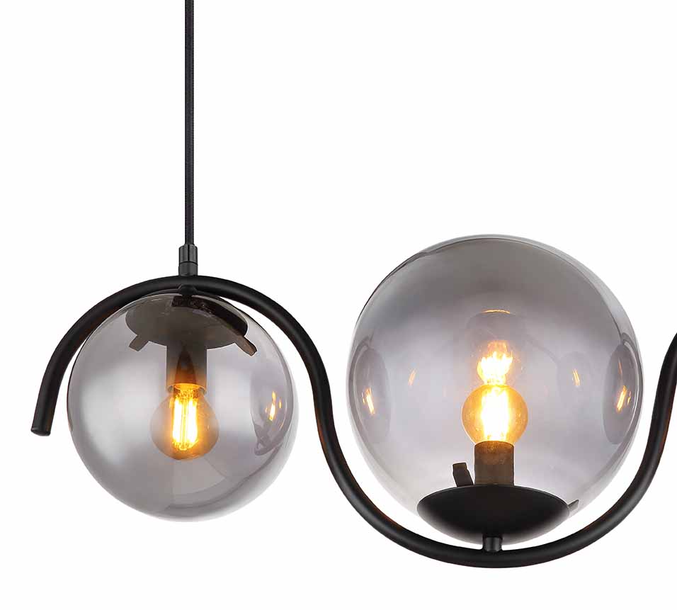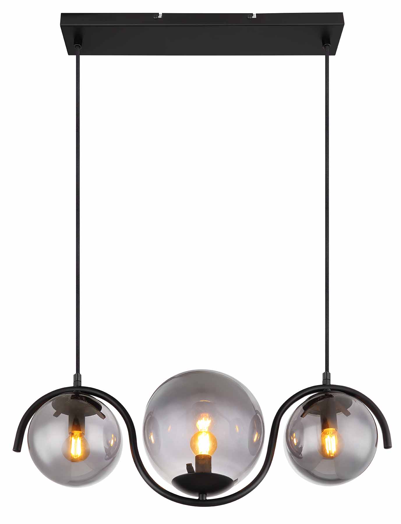 Tauchen Sie Ihren Raum in ein stimmungsvolles Licht mit unserer stilvollen Hängeleuchte. Diese Lichtinstallation besteht aus zwei mattschwarzen Drähten, die elegant von einer schlanken Deckenhalterung zu einem S-förmigen Metallbalken herabsteigen. Drei E14-Fassungen, sorgfältig in elegant gestalteten, rauchfarbigen Glasschirmchen eingefasst, befinden sich an diesem Balken. Die Fassungen bieten die Freiheit, die Farbe und Helligkeit des Lichts anzupassen, bis zu einer maximalen Kapazität von 25 Watt. Für Langlebigkeit und Energieeffizienz empfehlen wir die Verwendung von LED-Lampen.