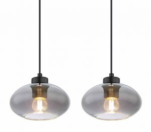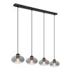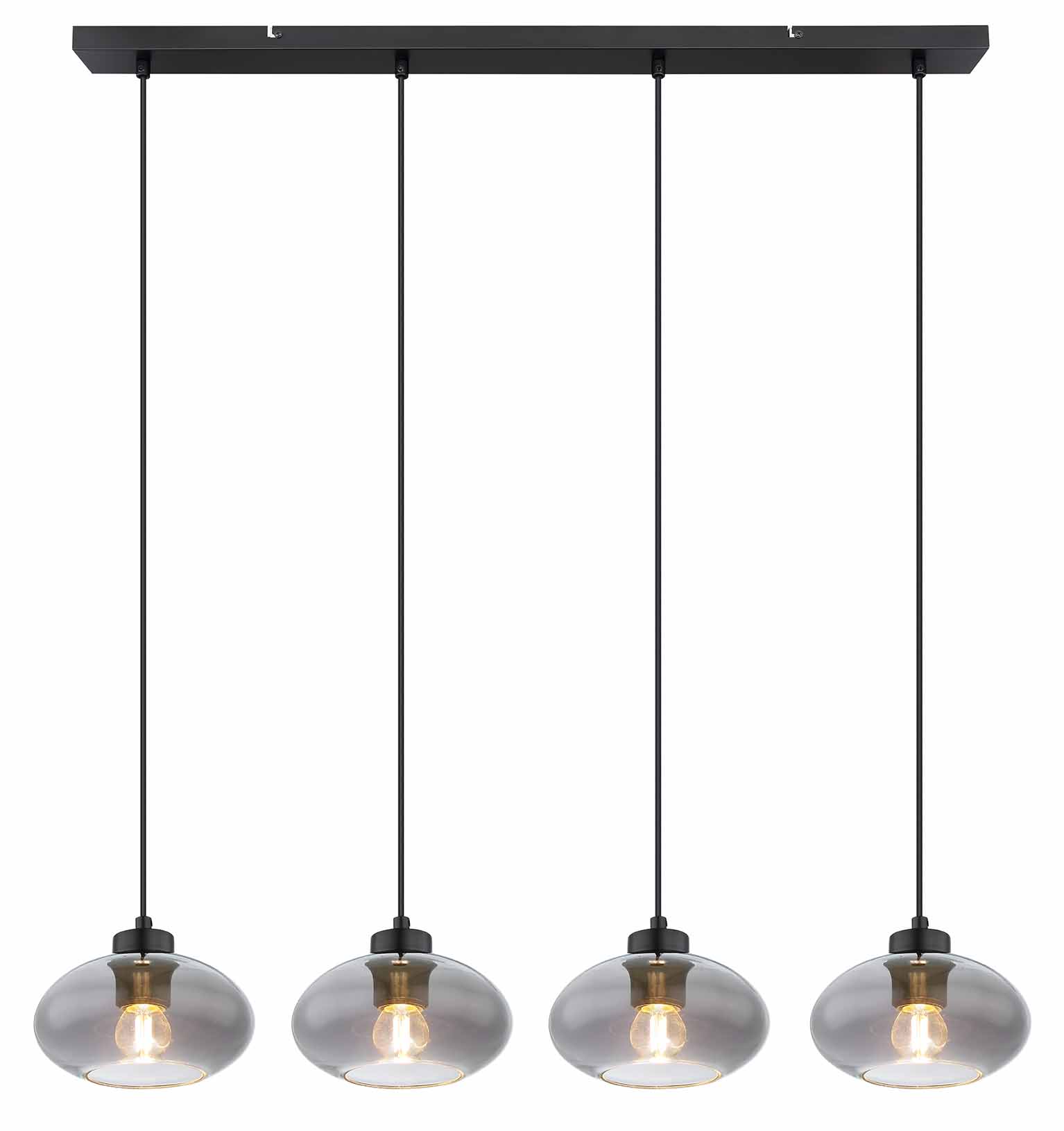 Diese elegante Pendelleuchte aus der SHAUN-Serie verfügt über eine schlanke schwarze Deckenhalterung (96x18cm), von der vier schwarze Kabel nach unten zu jeder E27-Fassung führen, die mit einem ovalen rauchigen Glasschirm ausgestattet ist. Wählen Sie selbst die Lichtfarbe und Helligkeit bis maximal 40 Watt.