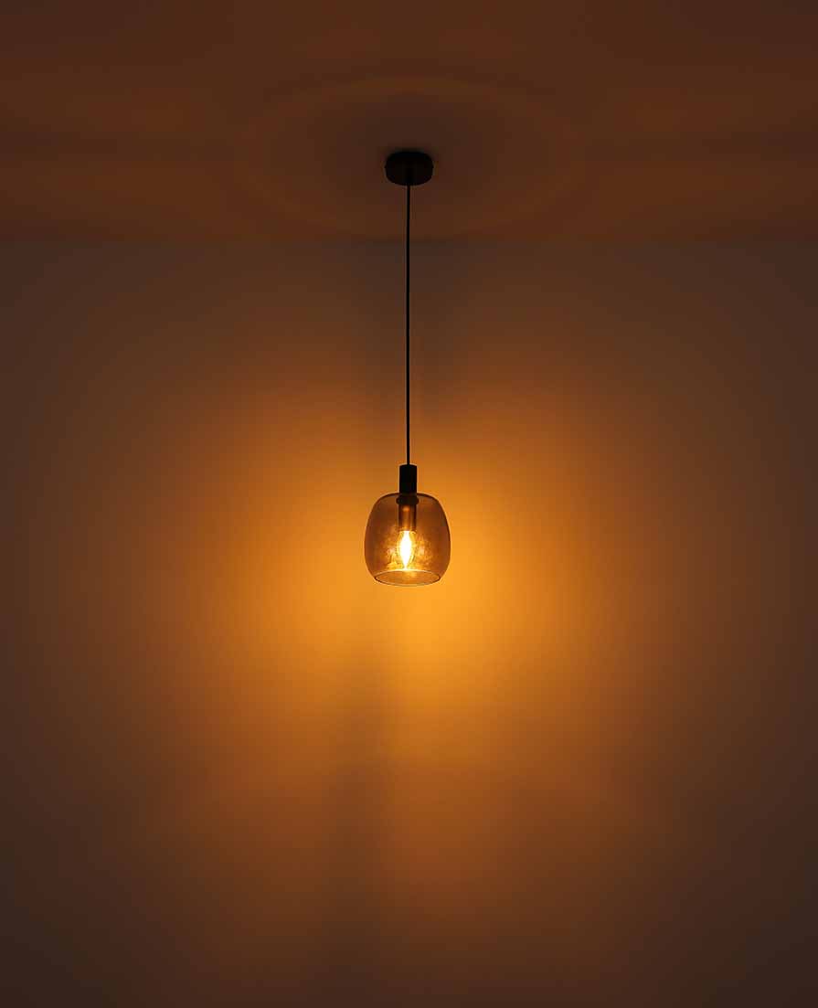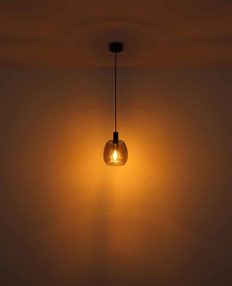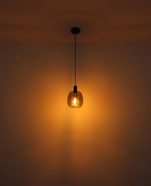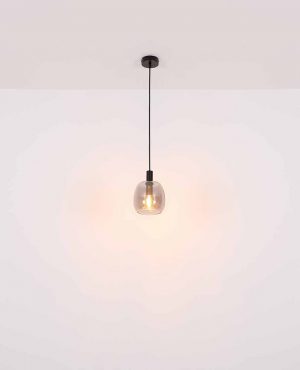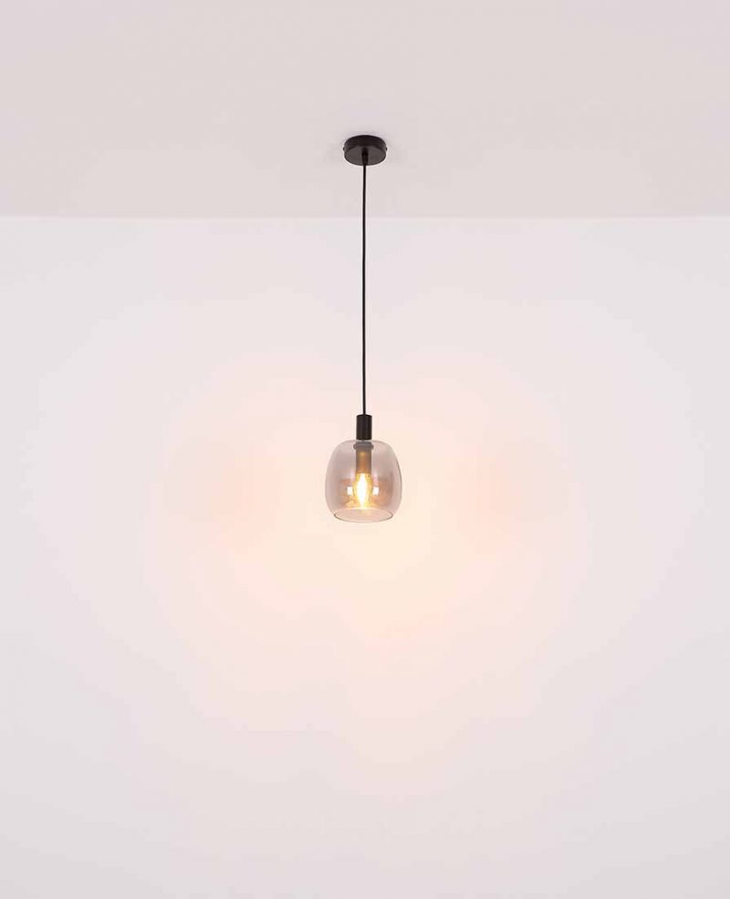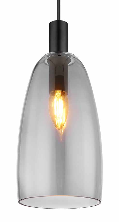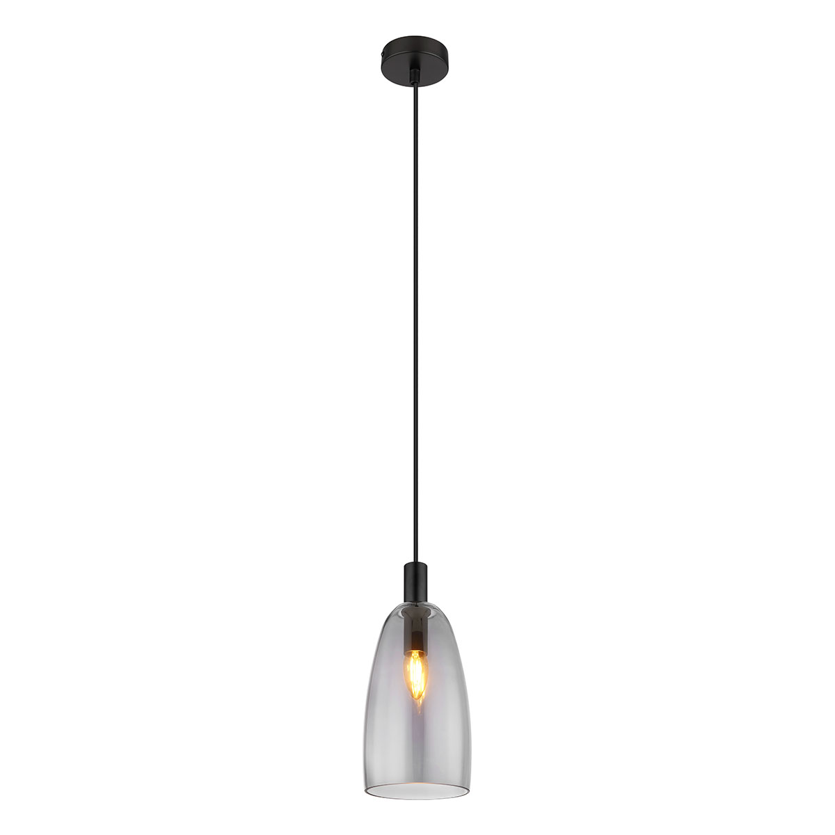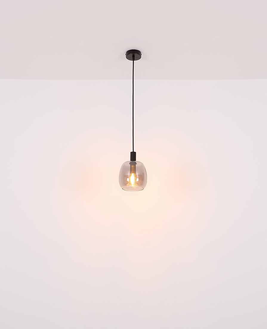 Diese elegante Hängeleuchte beeindruckt mit ihrem wunderschönen Design. Von einer runden Deckenmontage hängt ein 1,2 m langes schwarzes Kabel zu einer E14-Anschlussdose, ausgestattet mit einem rauchfarbenen Glasschirm (Ø 14 cm) und schwarzen Dekorationen. Sie können die Lichtfarbe und Helligkeit nach Wunsch bis zu einer maximalen Leistung von 40 Watt anpassen. Zur Energieeinsparung und langen Lebensdauer werden LED-Lampen empfohlen.