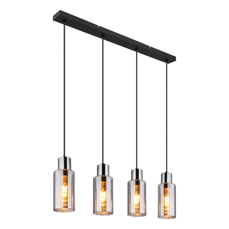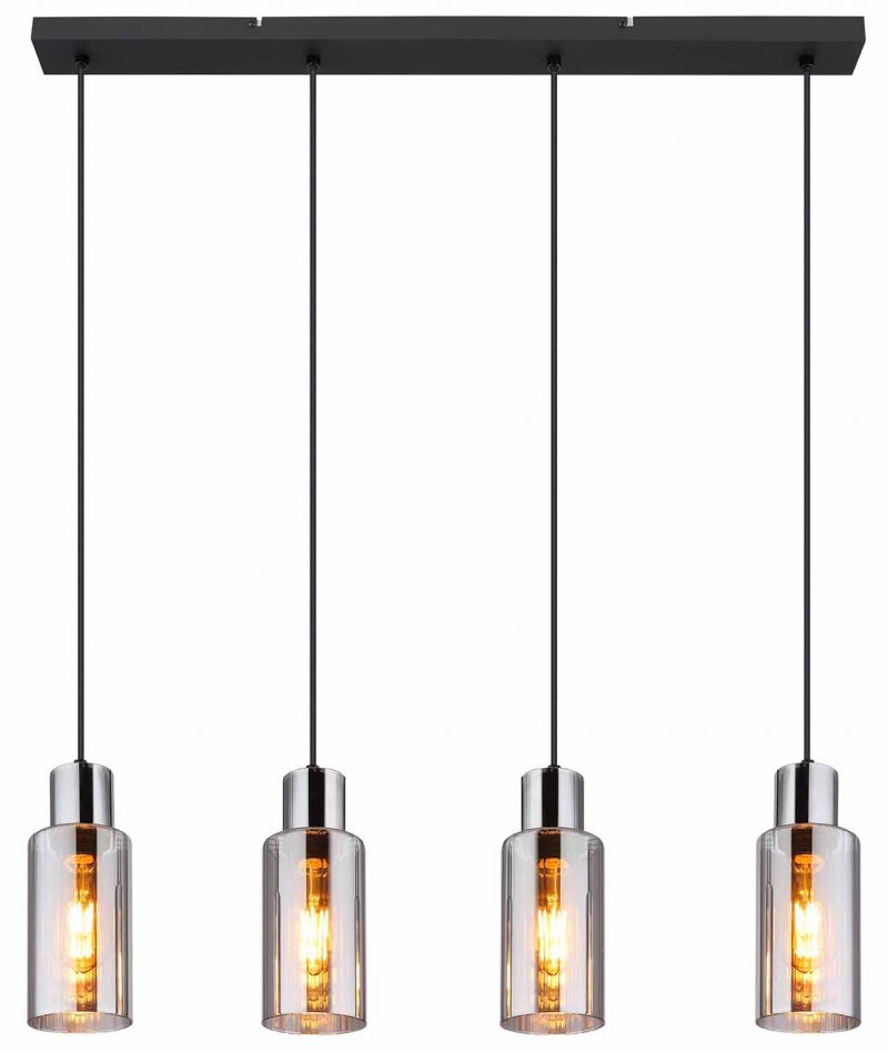 Die Pendelleuchte ist eine raffinierte Mischung aus mattschwarzem Metall und rauchigem Glas, ideal für eine zeitgemäße Einrichtung. Mit einem höhenverstellbaren schwarzen PVC-Kabel bietet sie Flexibilität und Stil. Die Abmessungen betragen 820x100x1200 mm, wodurch diese Lampe eine auffällige Erscheinung ist. Vier E27-Fassungen bieten Platz für Leuchten bis zu 25W (nicht enthalten). Beleuchten Sie Ihr Zuhause mit dieser eleganten und modernen Pendelleuchte.