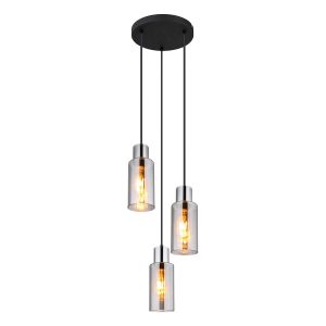<pDiese stilvolle Pendelleuchte kombiniert matt schwarze Metall und rauchiges Glas für eine moderne Ausstrahlung. Die Höhe kann mit dem schwarzen PVC-Kabel angepasst werden. Mit einem Durchmesser von 320 mm und einer Höhe von 1200 mm ist diese Leuchte ein echter Blickfang. Ausgestattet mit drei E27-Fassungen, geeignet für Leuchten bis 25W (nicht enthalten). Diese Pendelleuchte wird Ihrem Interieur neuen Glanz verleihen und eine luxuriöse Atmosphäre schaffen.