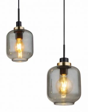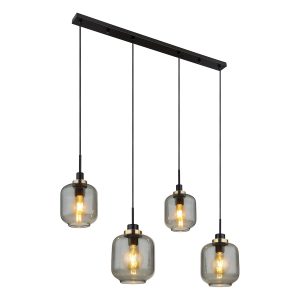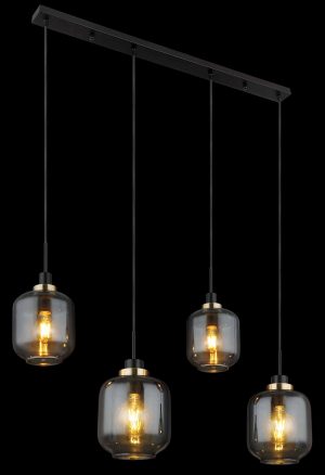 Bereichern Sie Ihr Interieur mit dieser Pendelleuchte aus der Fanni-Serie, bestehend aus vier schwarzen Kabeln unterschiedlicher Längen bis zu 1,2 m, die von einer länglichen schwarzen Deckenhalterung (1 m) ausgehen, wobei jedes Kabel in einer E27-Fassung mit bronzefarbenen Dekorationen und künstlerisch geformten rauchfarbigen Glasabdeckungen (Ø 24 cm) endet. Geeignet für Lampen bis 40 Watt, ideal für Energieeinsparung mit LED-Lampen.