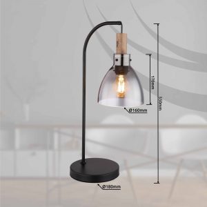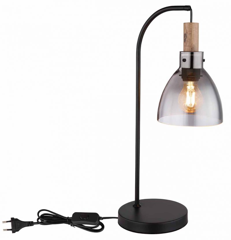 Diese formschöne Tischlampe aus der MATTEA-Serie inspiriert mit einem schlichten Design. Ein schwarzer Metallstab von 55 cm Länge verläuft von einer runden Basis und endet an einer E27-Fassung, die in einem wohlförmigen rauchfarbenen Glasschirm mit Holzdekorationen eingepackt ist. Mit der E27-Fassung können Sie selbst die Lichtfarbe und Helligkeit bis zu einer maximalen Leistung von 9 Watt bestimmen. Aufgrund der langen Lebensdauer und Energieeinsparung empfehlen wir LED-Lampen.