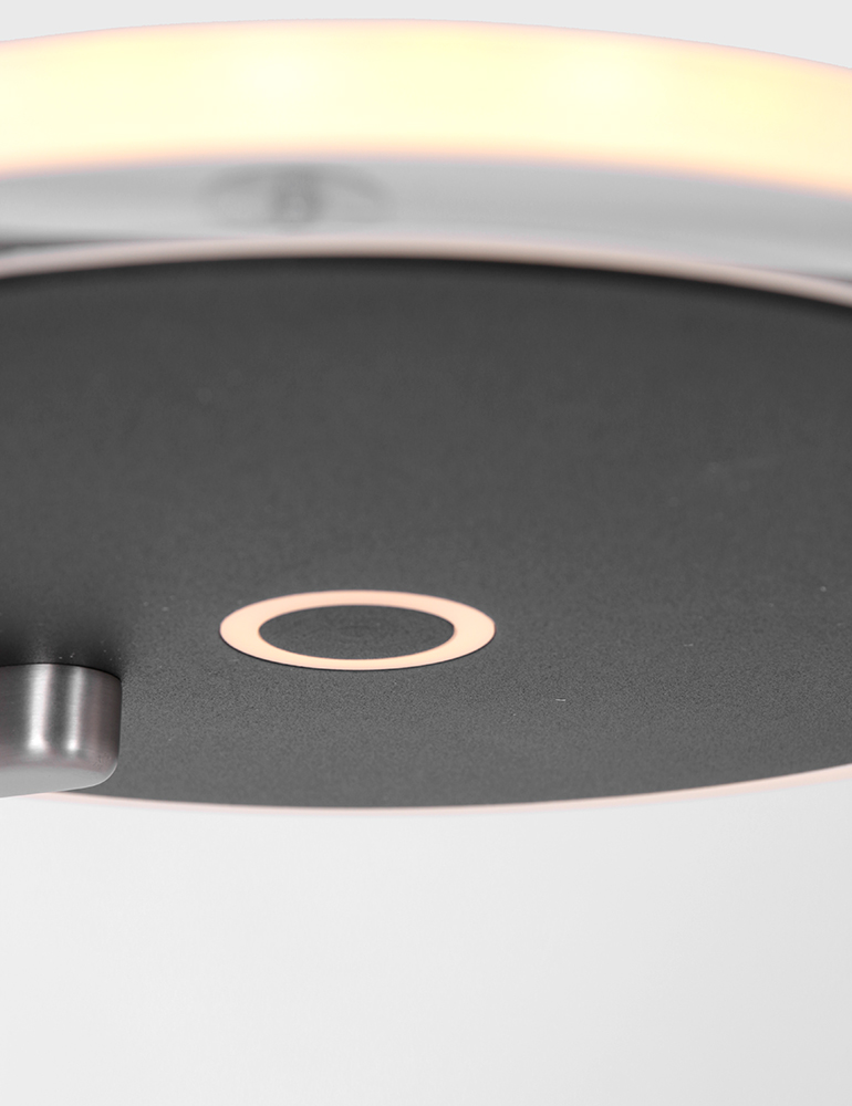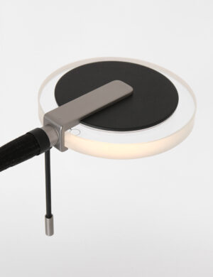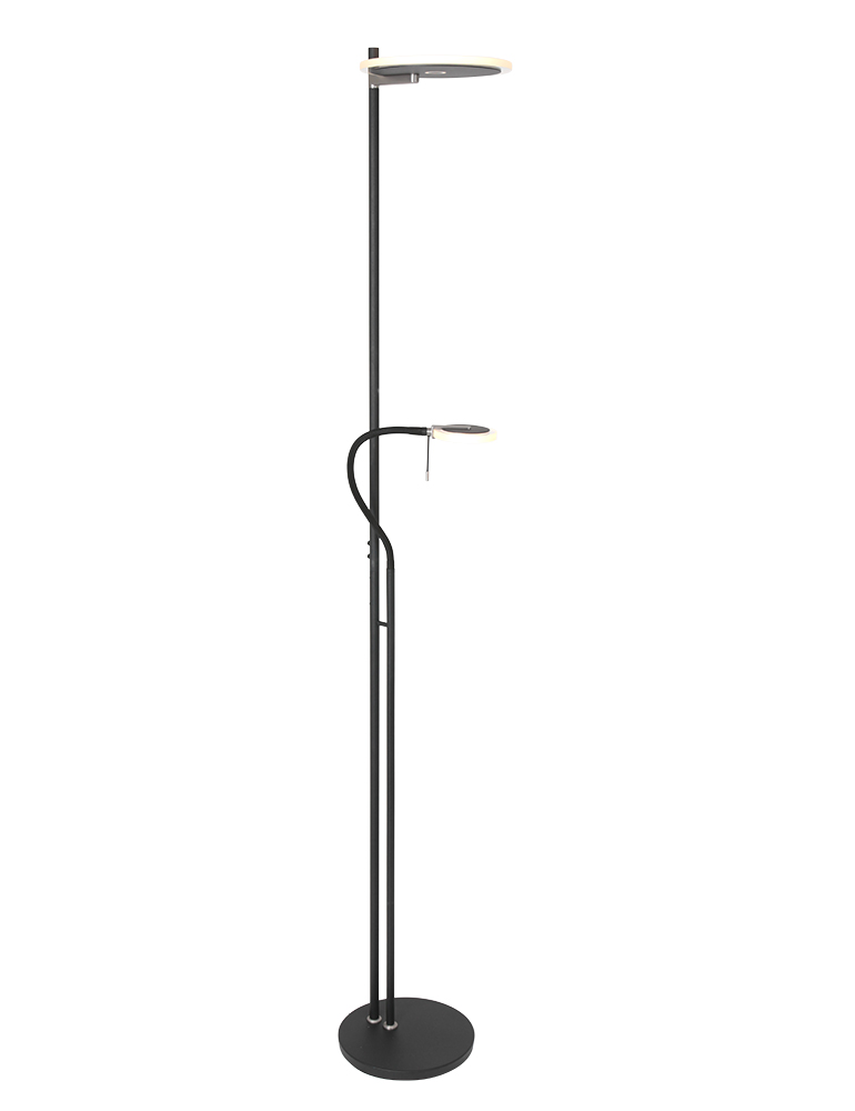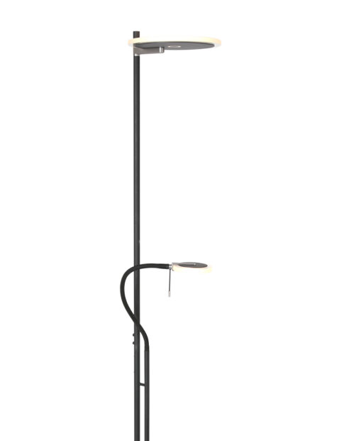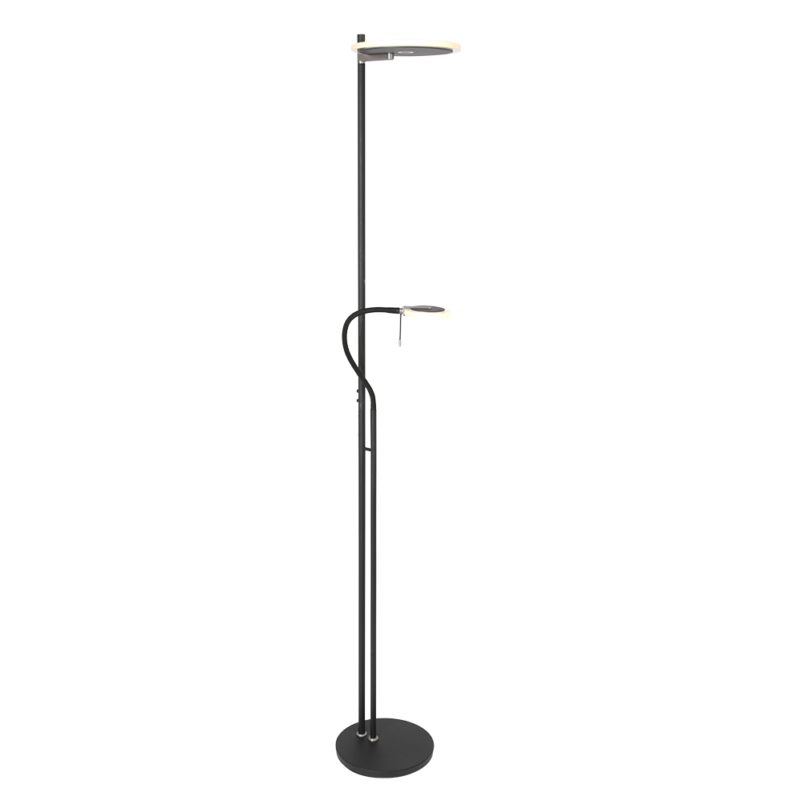 Eine Stimmungs- und Leselampe in einem, clever und platzsparend! Dieser schwarze Hightech Turound Uplighter hat in der Mitte des Stabs eine flexible Leselampe. Du kannst sie zusammen oder separat mit den zwei dim-to-warm Knöpfen verwenden. Der obere transparente LED-Reflektor strahlt nach oben, der an dem flexiblen Lesearm verstellbar und drehbar ist. Ideal in kleinen Arbeits- und Wohnbereichen.