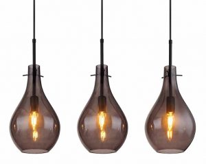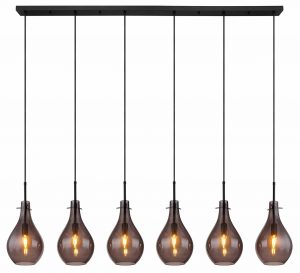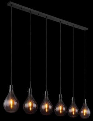 <pDiese 140 cm lange Hängeleuchte, aus schwarzem Metall mit sechs rauchfarbenen Gläsern, strahlt Eleganz aus. Die Leuchte verfügt über sechs E14-Anschlüsse, die jeweils maximal 40 Watt unterstützen, was Ihnen die Freiheit gibt, die Beleuchtung nach Wunsch anzupassen. Ideal für Wohn- und Esszimmer und empfohlen mit LED-Lampen für Energieeinsparung und Nachhaltigkeit.