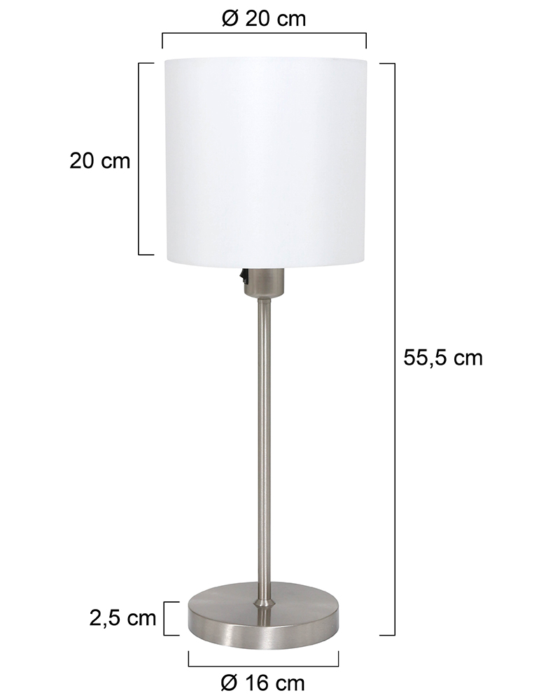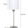 Die Noor Tischlampe von Mexlite kombiniert einen stilvollen Metallrahmen mit einem raffinierten Leinen-Schirm. Der weiße Schirm hat einen Durchmesser und eine Höhe von 20 cm. Die Gesamthöhe der Lampe beträgt 55,5 cm, mit einem Fußdurchmesser von 16 cm. Die E27-Fassung ist für Lichtquellen bis 40 Watt geeignet. Die Lampe wird mit einem 180 cm langen Kabel geliefert und hat einen Ein/Aus-Schalter an der Fassung.