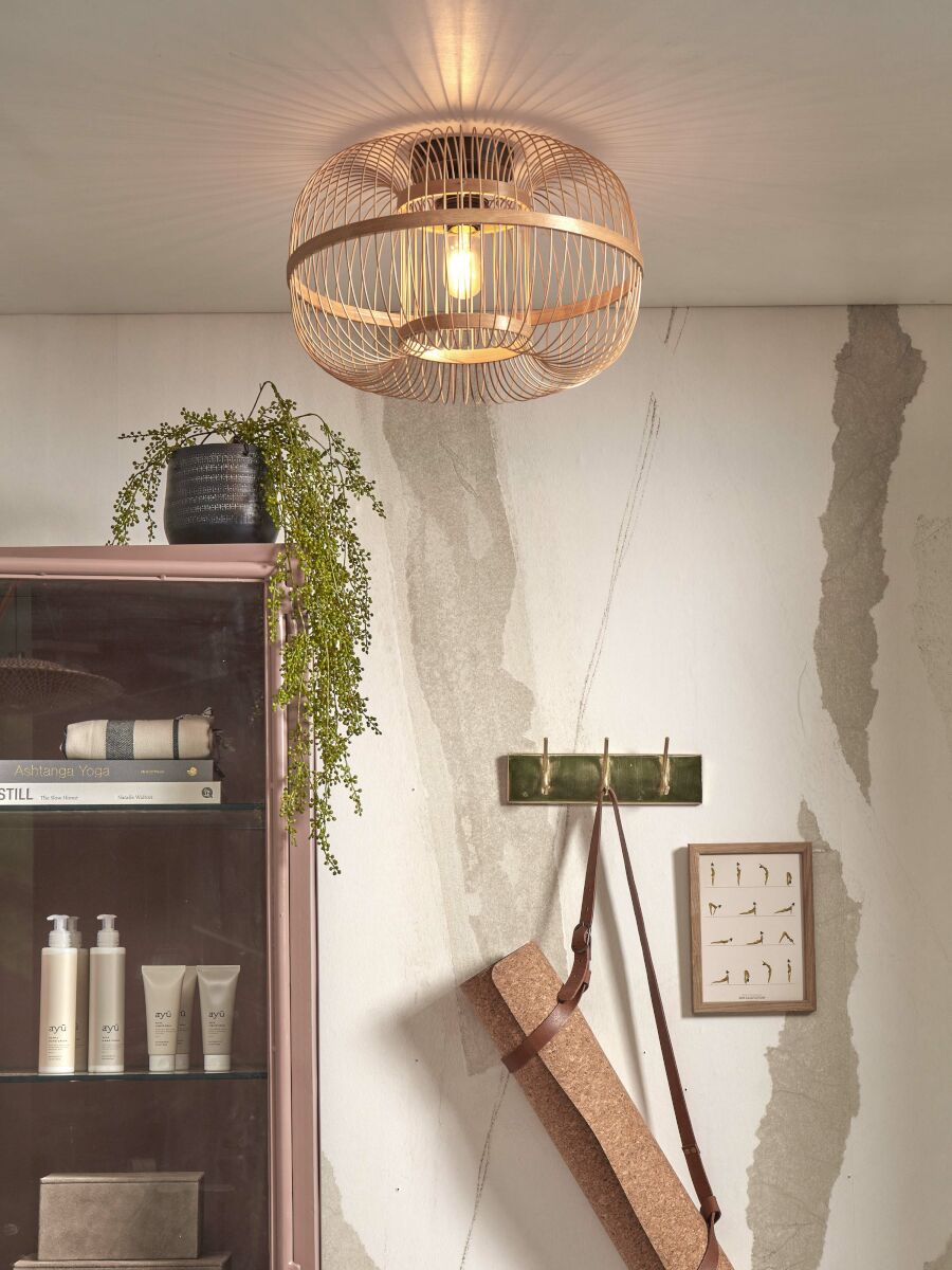 Östliche Deckenleuchte aus Metall und Bambus in natürlichen Farbtönen, geeignet für Esszimmer, Flur, Schlafzimmer oder Wohnzimmer. Ausgestattet mit einer großen E27-Fassung und staubdicht (IP20). Fügen Sie Ihrem Interieur mit dieser einzigartigen Lampe einen rustikalen und exotischen Touch hinzu.
