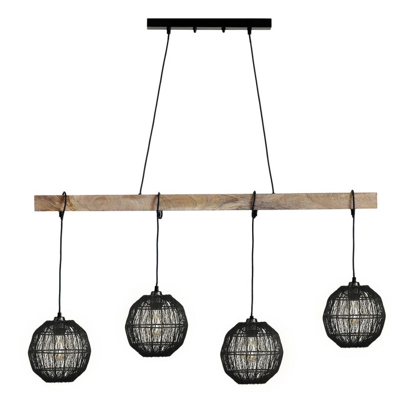 Die HERMI II Pendelleuchte vereint Raffinesse und einzigartiges Design. Mit vier Anhängern, die mit Metallgitterkugeln ausgestattet sind, schafft sie eine dynamische Beleuchtung in Ihrem Wohn- oder Esszimmer. Die Kombination aus mattschwarzem Metall und natürlichem Holz sorgt für einen stilvollen Kontrast. Ideal zur Beleuchtung großer Räume.
