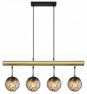 <pDiese wunderschöne Pendelleuchte der FITZ-Serie begeistert mit ihrem großartigen Design. Von einer rechteckigen Deckenmontage verlaufen zwei Kabel zu einem goldfarbenen Mittelbalken mit einer Länge von 90 cm, auf dem sich vier E27 LED-Anschlüsse befinden, jeweils mit einem wohlgeformten dekorativen Schirm. Mit den E27 LED-Anschlüssen können Sie die Lichtfarbe und Helligkeit selbst bestimmen, bis zu einer maximalen Leistung von 9 Watt. Aufgrund der langen Lebensdauer und Energieeinsparung empfehlen wir LED-Lampen.