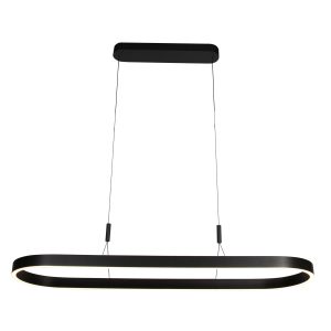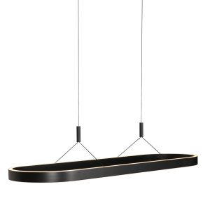 Die Mykty-Hängelampe mit ovalem Design von 120 Zentimetern Breite ist eine stilvolle Wahl für alle, die nach kraftvoller und stimmungsvoller Beleuchtung suchen. Die matt schwarze Oberfläche und die klaren Linien verleihen der Lampe eine moderne Ausstrahlung, die perfekt in sowohl industrielle als auch zeitgenössische Interieurs passt. Durch das ovale Design wird das Licht schön über einem Esstisch, Kücheninseln oder Konferenztischen verteilt.
