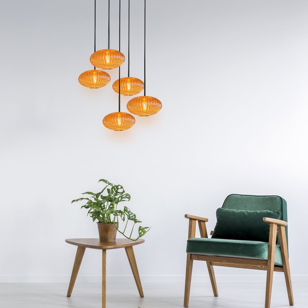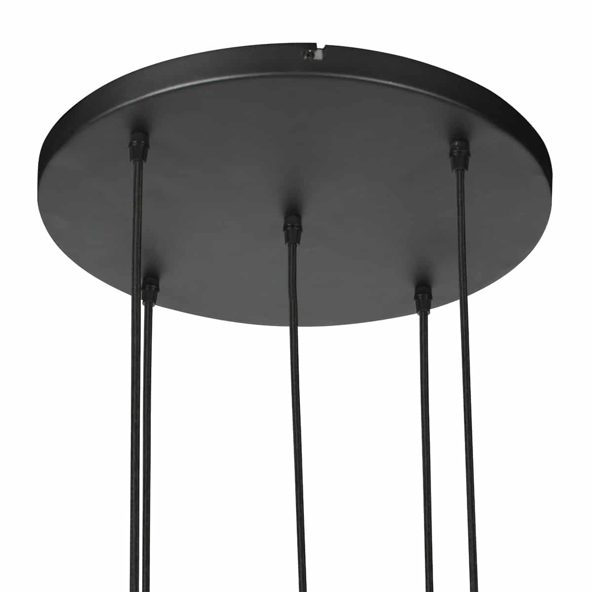 Die fünf Kabel sind in der Höhe verstellbar, sodass du die Komposition selbst bestimmen kannst. Die Lampe ist mit E27-Fassungen ausgestattet und eignet sich für LED-Leuchtmittel. In Kombination mit einem externen Dimmer kannst du die Lichtintensität einfach anpassen. Ideal für ein Foyer, einen Flur oder über einem Eßtisch.