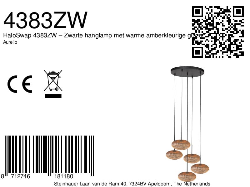 Die Aurelio 4383ZW</strong ist eine stilvolle hängende Lampe mit fünf Lichtquellen und einer verspielten Anordnung. Das schwarze Gestell wird kombiniert mit ufo-förmigen, bernsteinfarbenen, gerippten Glas-Schirmen, was eine warme und stimmungsvolle Lichtverteilung gewährleistet.