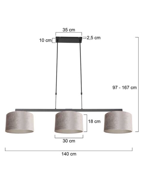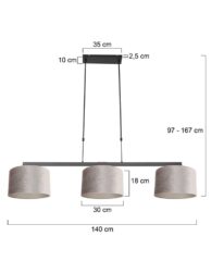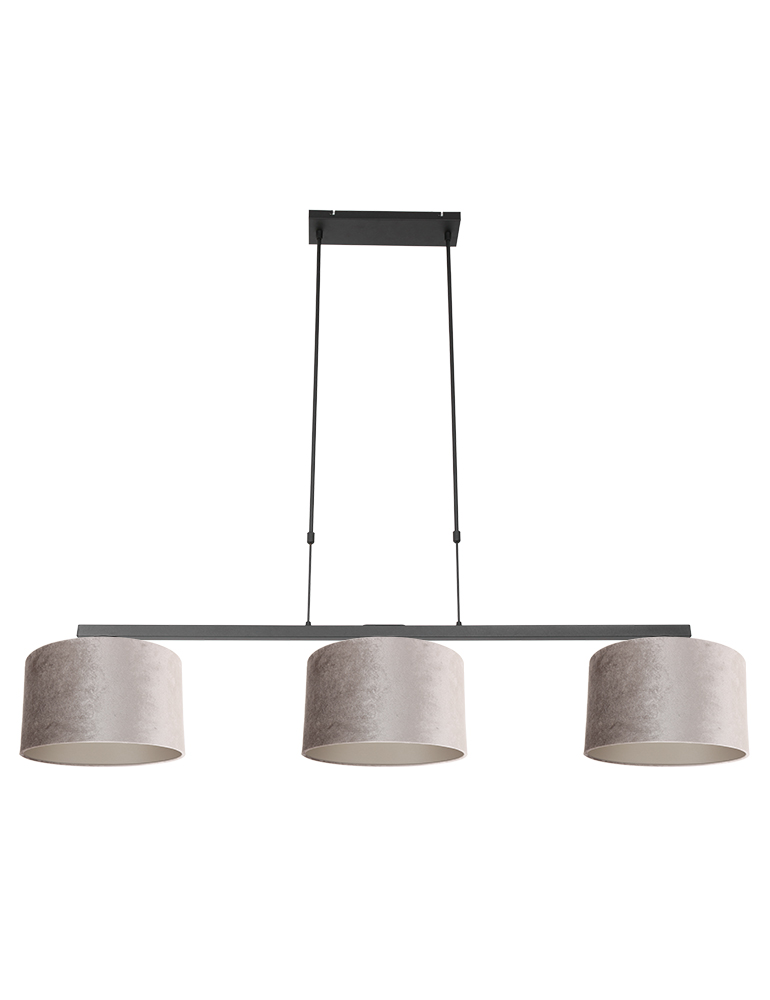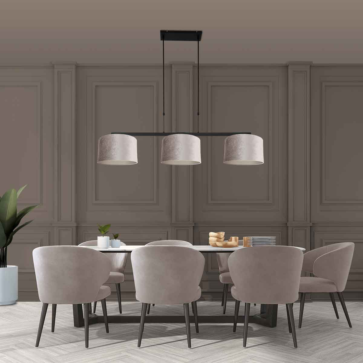 Die drei grauen Veloursschirme mit 30 cm verleihen der Lampe eine elegante Ausstrahlung, die sich mühelos in moderne Interieurs einfügt. Diese Lampe ist eine perfekte Wahl für alle, die auf der Suche nach einer eleganten und zeitgemäßen Beleuchtung sind. Diese Hängeleuchte wird mit 2 Jahren Garantie geliefert.