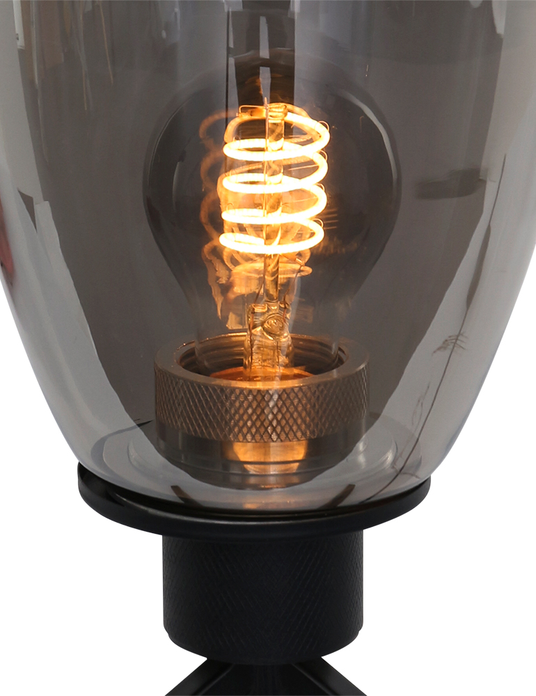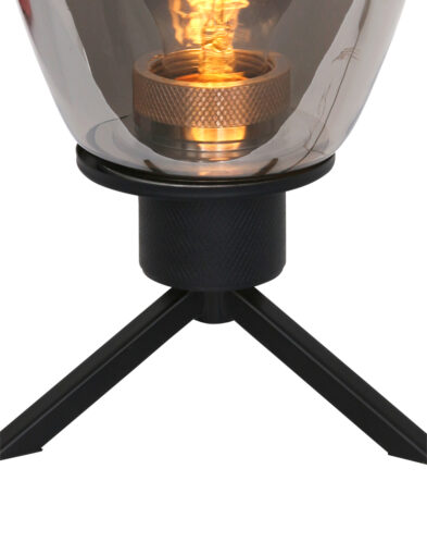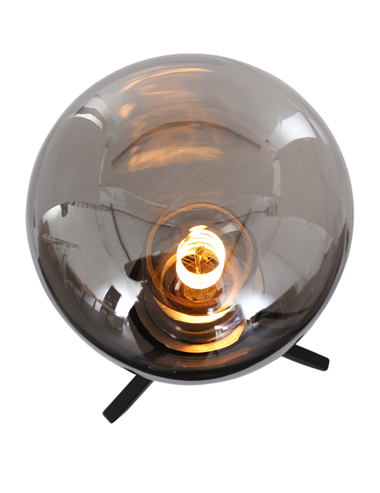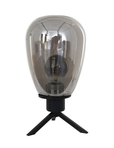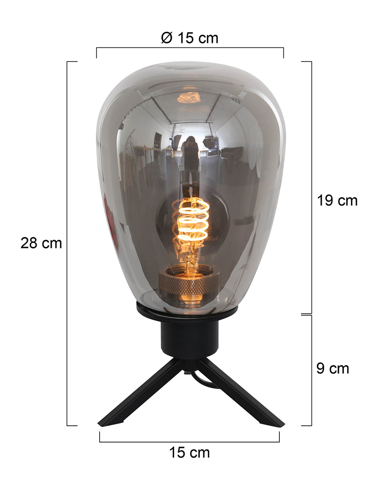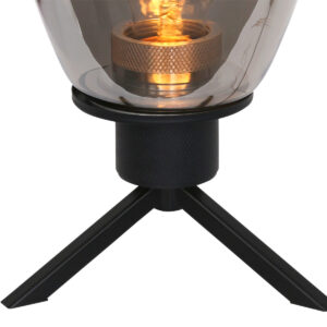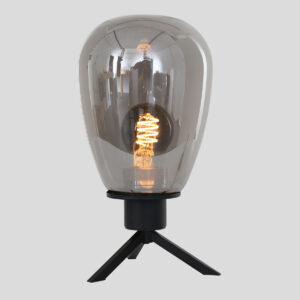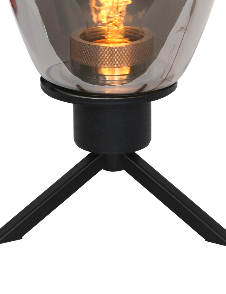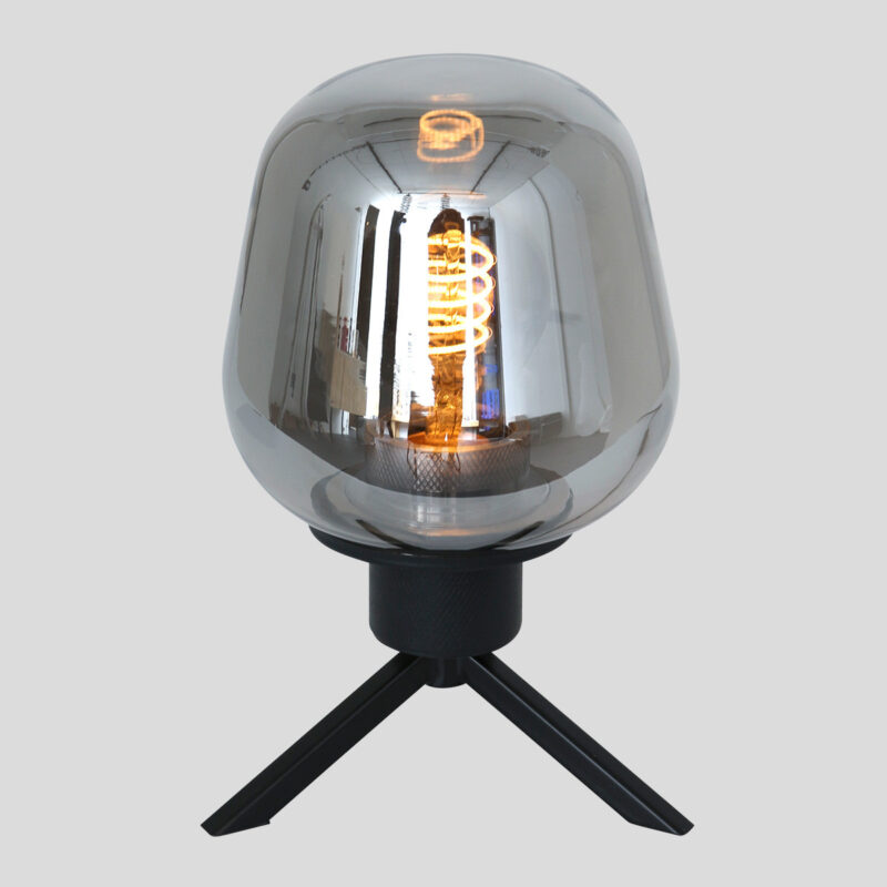 Eine Kombination aus industriellem und Vintage-Design mit raffinierter Verarbeitung: Diese Reflexion Tischleuchte auf Dreibein erobert sofort dein Herz. Der trendige rauchglasierte Schirm sieht aus wie eine übergroße Glühbirne. Setze einen zusätzlichen Akzent mit einer rauchglasigen Lichtquelle in derselben Form. Das schwarze Metallgestell mit stabiler Dreibeinstruktur hat ein Vintage-Webmuster. Platziere diese Stimmungsleuchte gut sichtbar und genieße die magische Ausstrahlung!