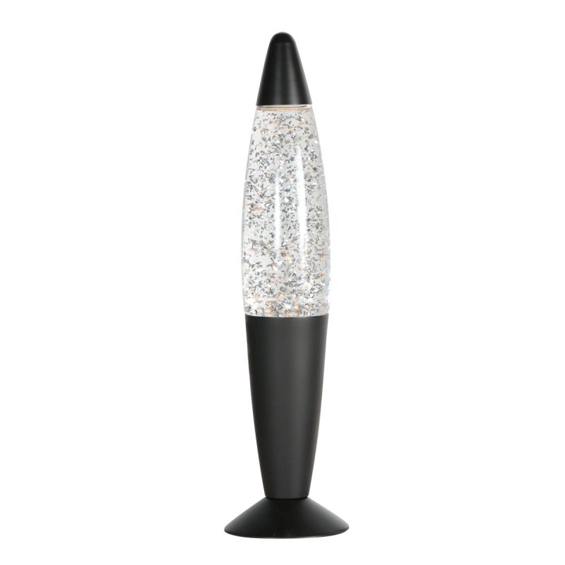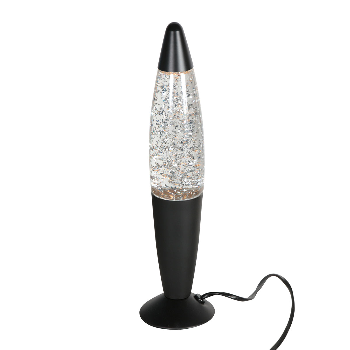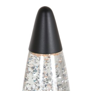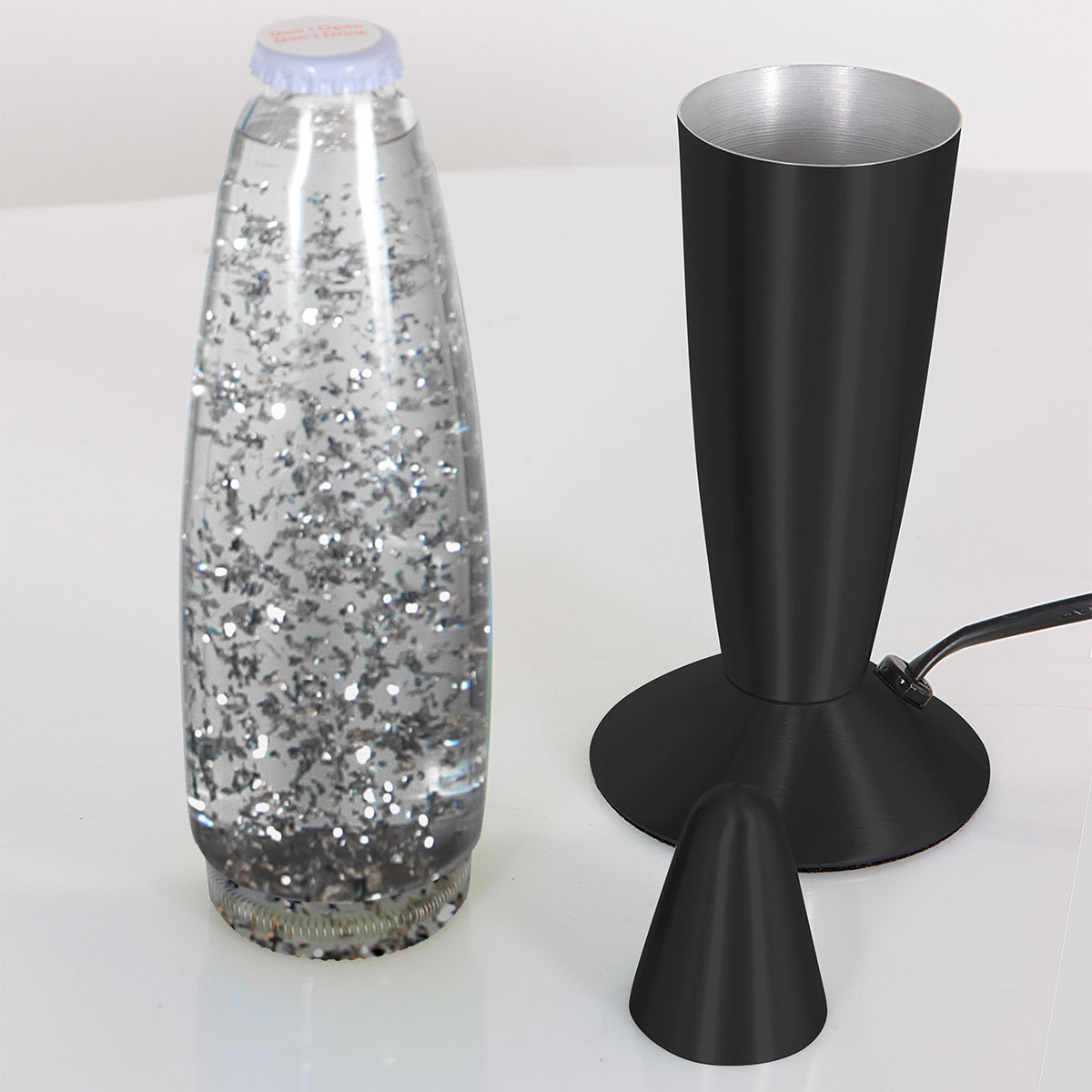 Die Volcan Glitzer Tischlampe von Mexlite kombiniert ein nostalgisches Design mit einem modernen Twist. Das schwarze Stahlgehäuse in Kombination mit der transparenten Flasche, gefüllt mit schwebenden Glitzerpartikeln, schafft einen bezaubernden Lichteffekt. Durch die Wärme der Lampe bewegen sich die Glitzer langsam durch die Flüssigkeit, was für eine beruhigende Atmosphäre und einen hypnotisierenden Effekt sorgt.