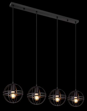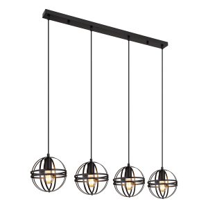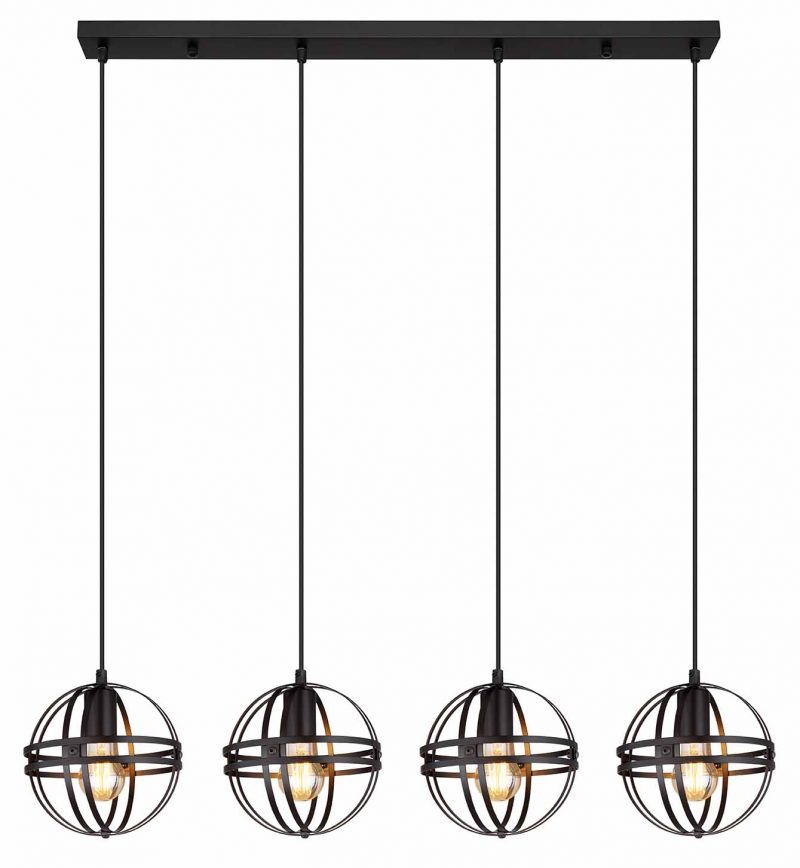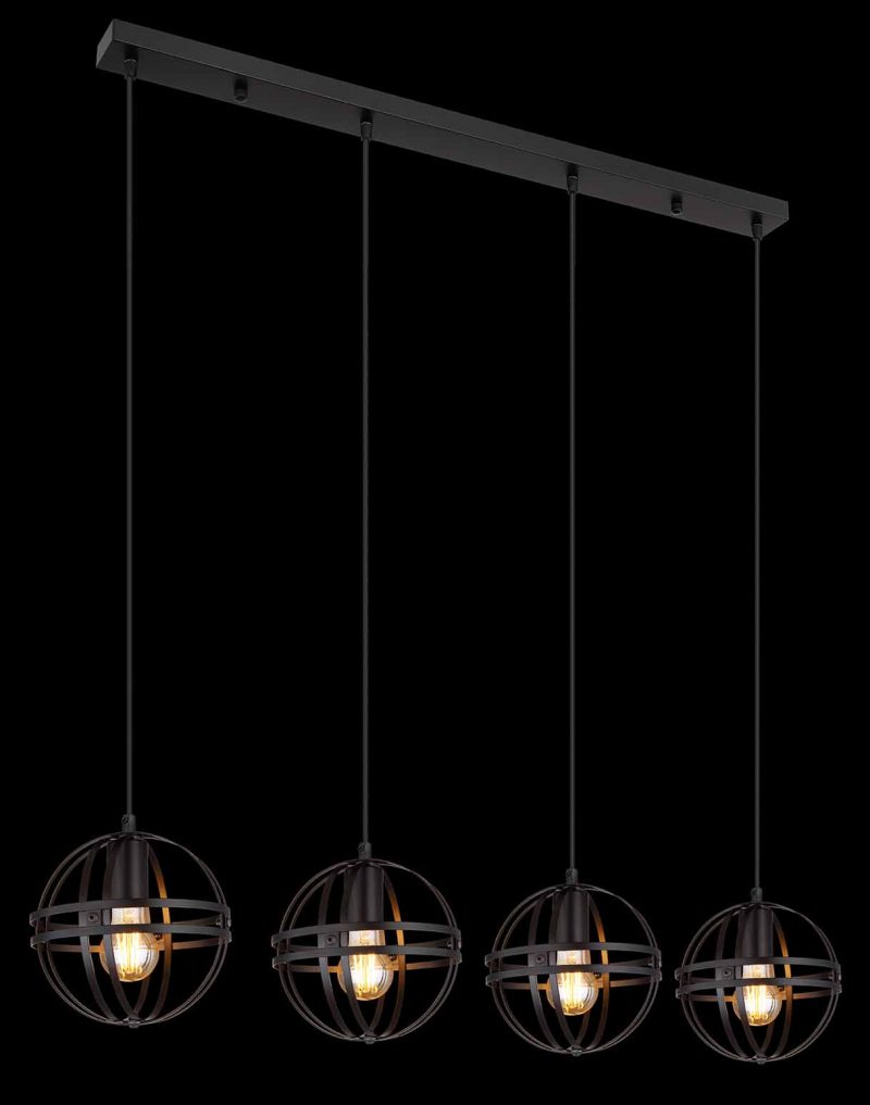 Diese moderne Pendelleuchte fällt durch ihr stilvolles Farbschema und die Materialien auf. Von einer schmalen Deckenmontage mit einer Länge von 1 m führt ein 1,2 m langes Kabel zu vier E27-Anschlüssen, die jeweils von einem runden Metallgehäuse in Schwarz (Ø20 cm) umhüllt sind. Mit diesen Anschlüssen können Sie die Lichtfarbe und Helligkeit nach Belieben anpassen, bis zu maximal 60 Watt. Zur Energieeinsparung und für eine längere Lebensdauer werden LED-Lampen empfohlen.