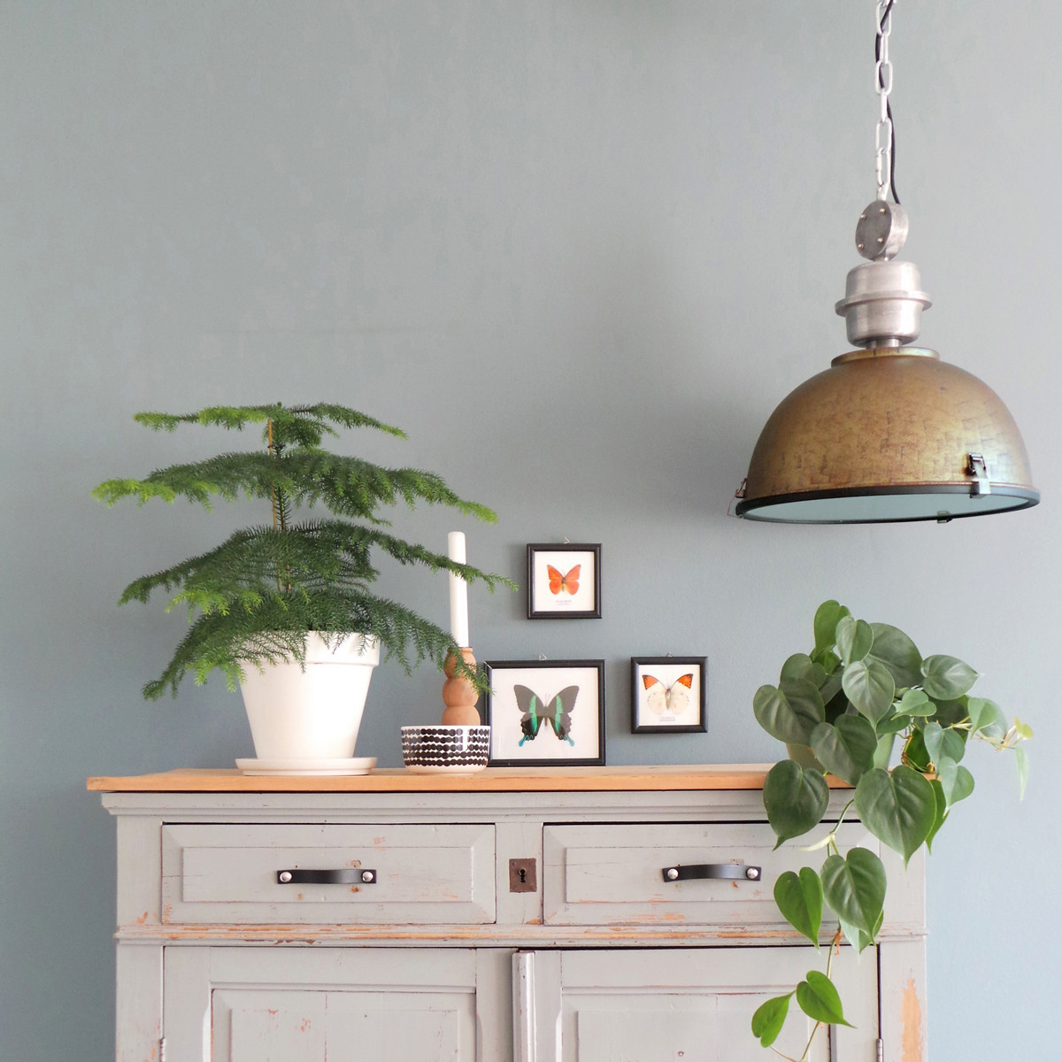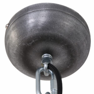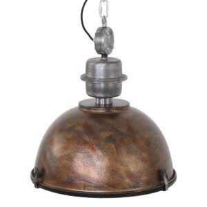Bikkel Steinhauer bekommt wieder eine Eins. Ihre “Bikkel” ist eine robuste und große Hängeleuchte. Diese Fabriklampe ist eine Halbkugel. Sie hängt an einer robusten Kette mit zinkfarbenen Elementen, darunter ein Schraubkarabiner. Ihr Blender ist mit drei Klemmen befestigt. Die Außenseite ist braun lackiert mit einem Effekt, der aussieht wie geschlagenes Kupfer. Diese “Bikkel” sieht großartig in deiner Retro- oder Landhaus-Einrichtung aus!