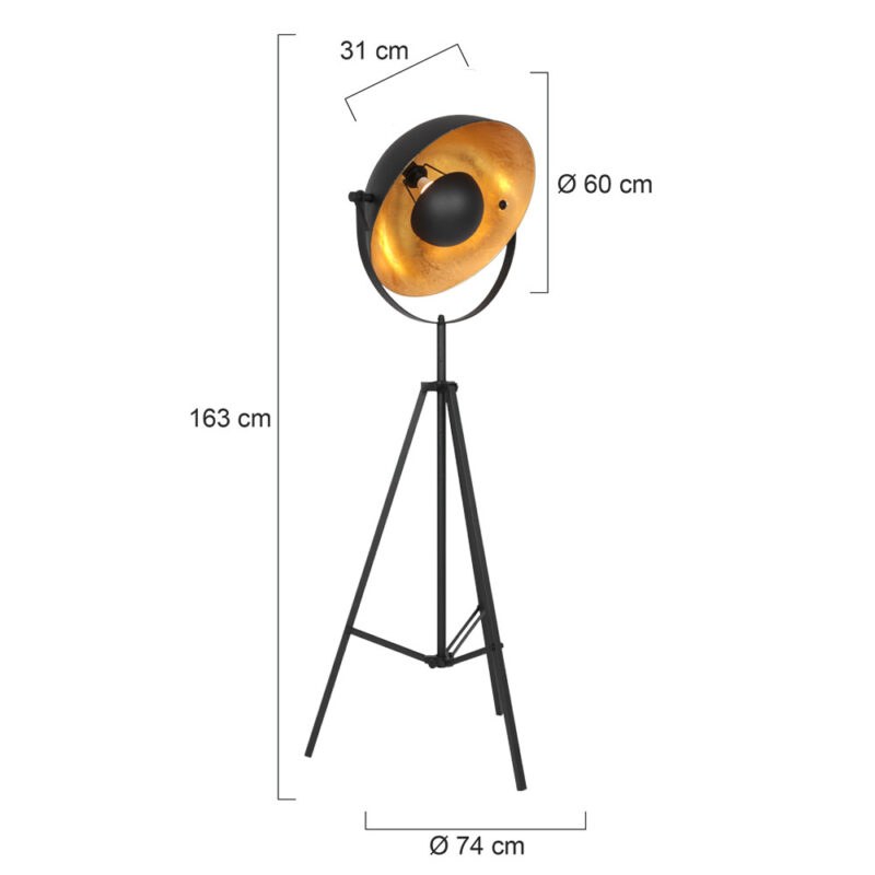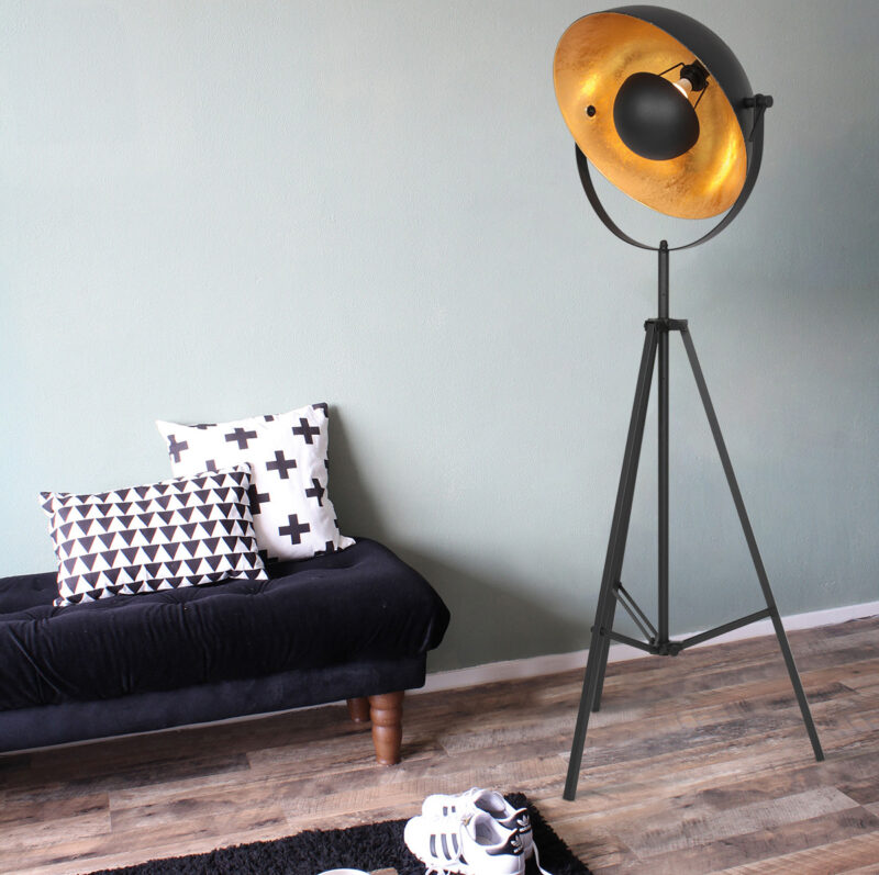 Die industrielle Stehlampe Sunflower ist mit einer großen schwarzen Kugel mit goldener Innenseite ausgestattet, was einen wunderschönen Kontrast schafft und das Licht auf stimmungsvolle Weise streut. Die Lampe verfügt über einen E27-Sockel, sodass Sie ganz einfach eine Lichtquelle nach Wunsch auswählen können. Der Ein-/Ausschalter befindet sich an der Kugel für eine einfache Bedienung. Das stabile Dreibein sorgt für Stabilität und macht die Lampe einfach zu bewegen.