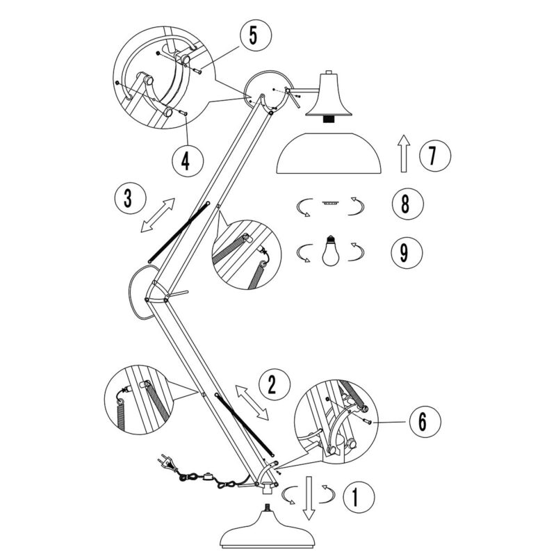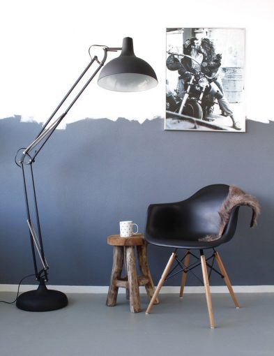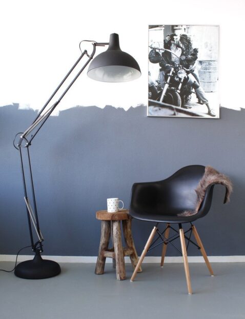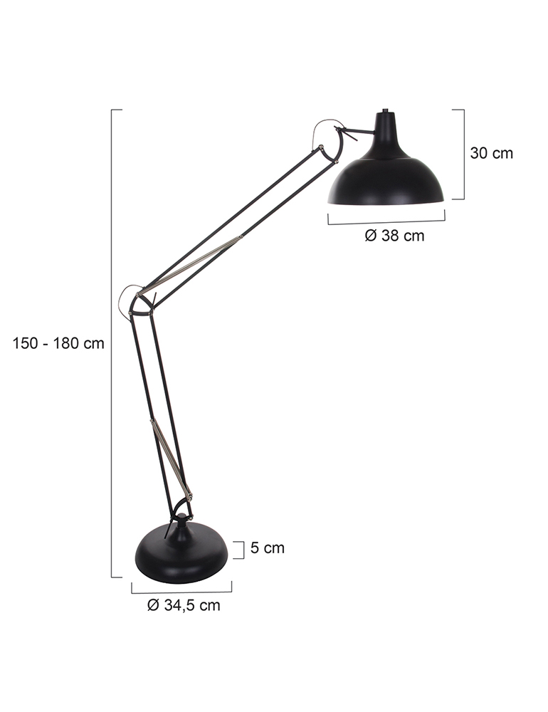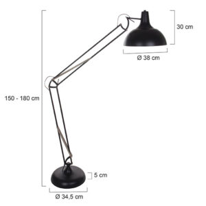 Große industrielle Stehlampe aus der Office Magna-Serie, eine beeindruckende Alternative zur klassischen Bogenlampe. Diese matt schwarze Metalllampe ist bis zu einer maximalen Höhe von 180 cm neigbar und hat einen stabilen Fuß für Stabilität. Der großzügige Schirm mit einem Durchmesser von 38 cm und einer Höhe von 30 cm ist geeignet für E27 Lichtquellen bis 40 Watt. Wird mit einem 175 cm langen Kabel und einem Ein/Aus-Schalter geliefert.
