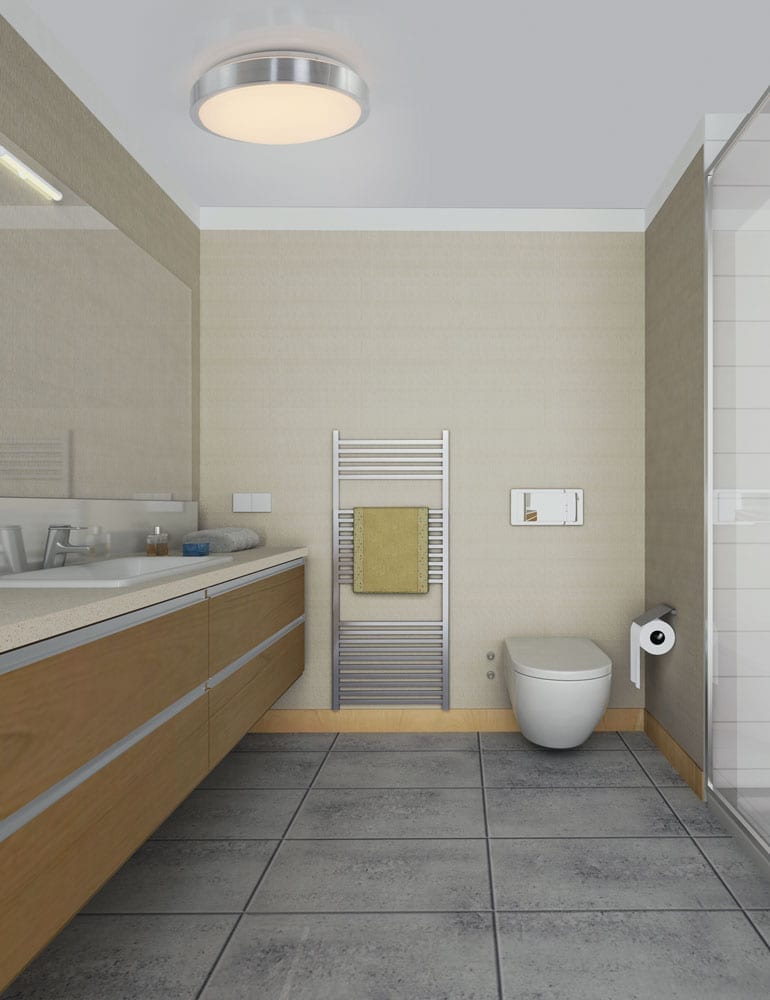 Stellar ist eine Lampe, die sich perfekt in ein modernes Interieur einfügt. Der Kunststoffschirm sorgt für eine stimmungsvolle Lichtstreuung. Im Flur, Badezimmer, Küche oder auf dem Gang. Wo platzierst du Stellar?