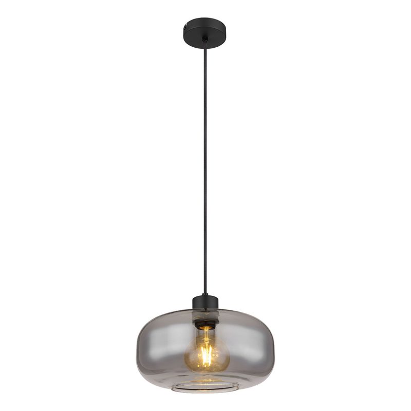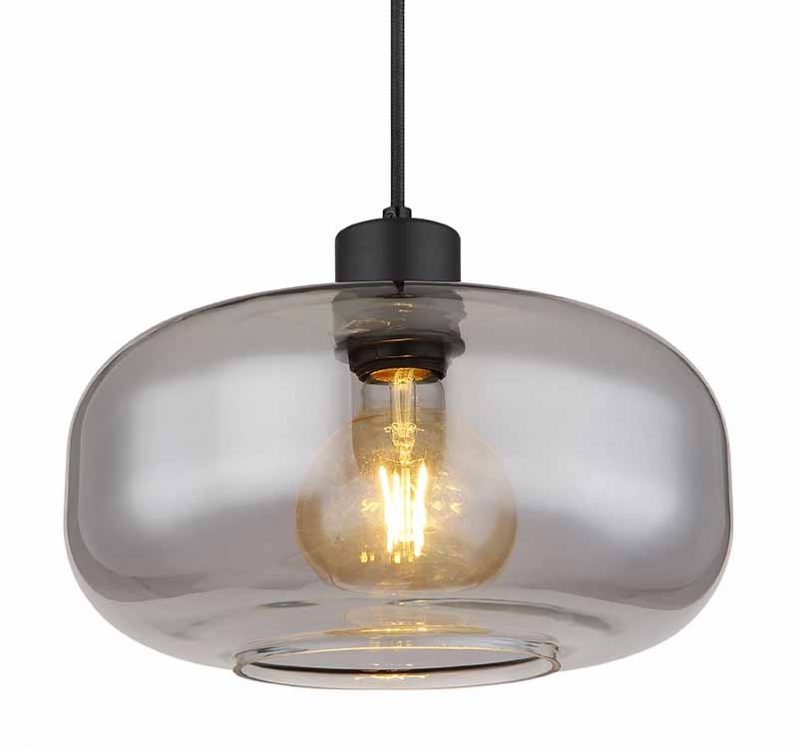 Verschönern Sie Ihr Interieur mit dieser minimalistischen Hängeleuchte, die ein 1,2 m langes schwarzes Kabel hat, das aus einer runden Deckenhalterung herausführt. Die E27-Fassung ist mit einem eleganten rauchfarbenen Glaskörper (Ø28 cm) bedeckt, perfekt zur Regulierung von Lichtfarbe und Helligkeit bis zu 40 Watt. LED-Lampen werden für optimale Energieeinsparung empfohlen.
