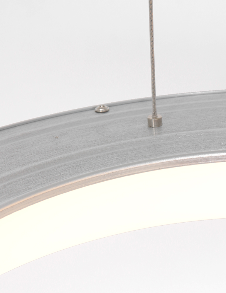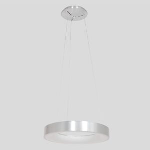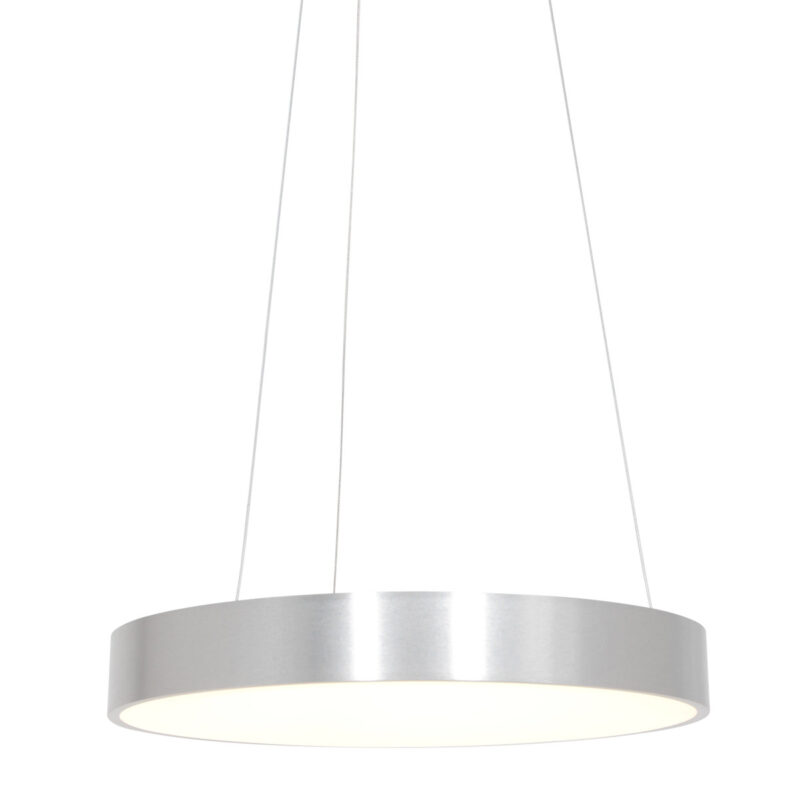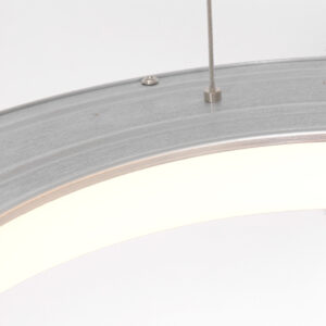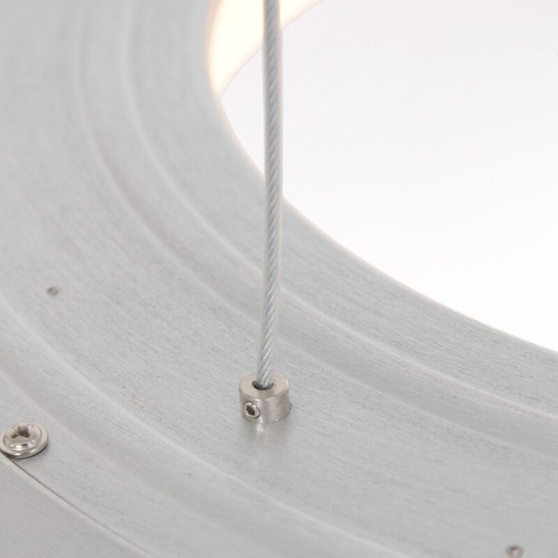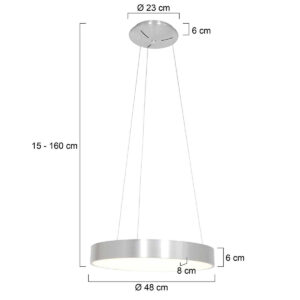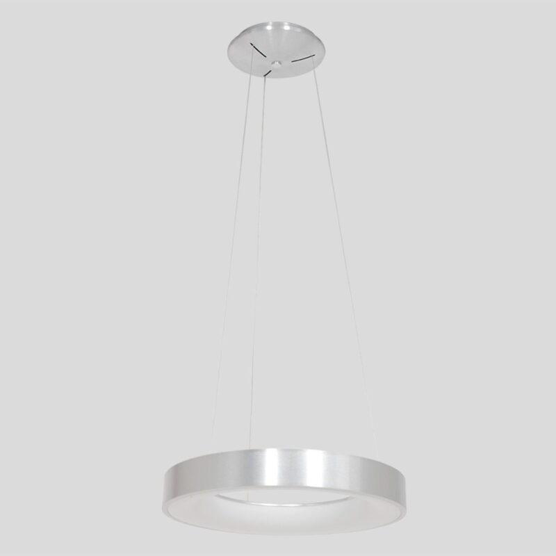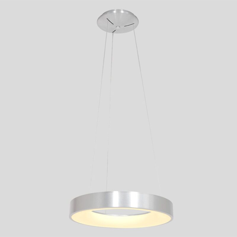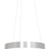 Die silberfarbene Hängeleuchte aus der Ringlede-Serie verfügt über ein integriertes 40 Watt LED-Modul mit einer Lichtfarbe von 2700 Kelvin und einer Lichtausbeute von 3600 Lumen. Dimmbar mit einem externen Wandschalter (nicht im Lieferumfang enthalten). Die Höhe ist zwischen 15 cm und 160 cm verstellbar. Der Ring hat einen Durchmesser von 48 cm und eine Höhe von 6 cm.