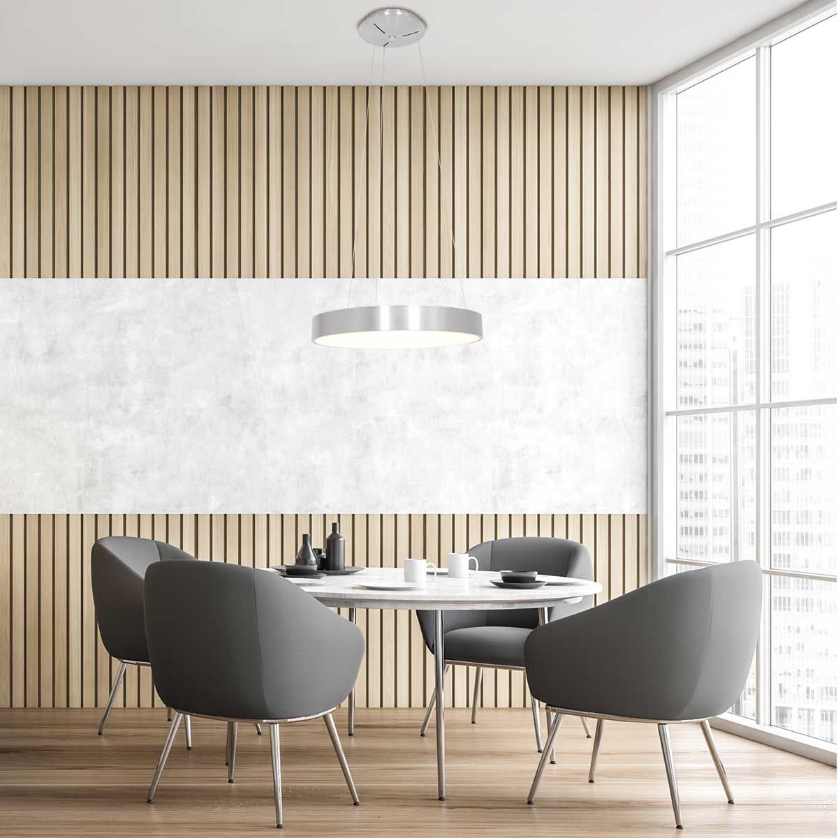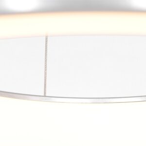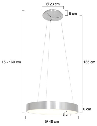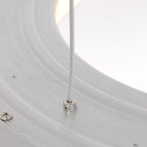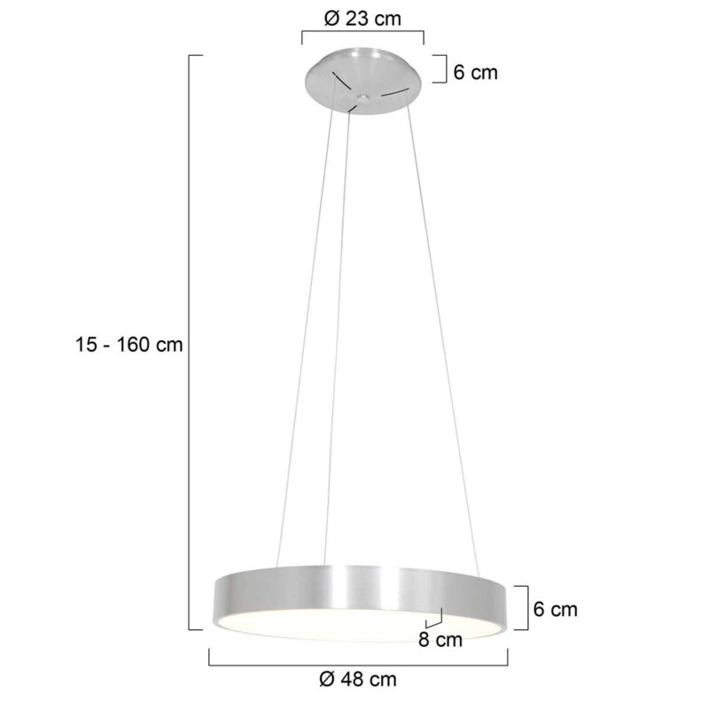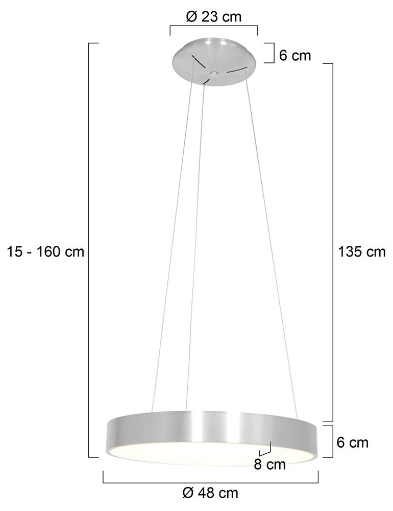 Die silberfarbene Hängeleuchte aus der Ringlede-Serie verfügt über ein integriertes 40 Watt LED-Modul mit einer Lichtfarbe von 2700 Kelvin und einer Lichtausbeute von 3600 Lumen. Dimmbar mit einem externen Wandschalter (nicht im Lieferumfang enthalten). Die Höhe ist zwischen 15 cm und 160 cm verstellbar. Der Ring hat einen Durchmesser von 48 cm und eine Höhe von 6 cm.