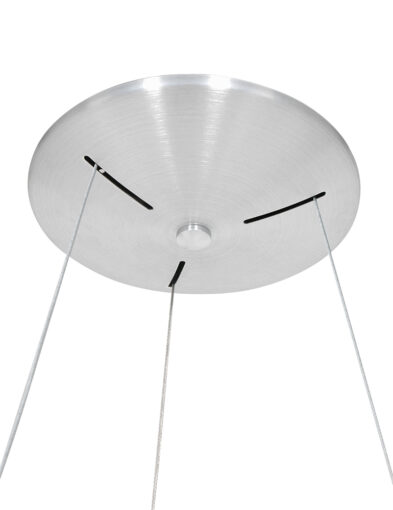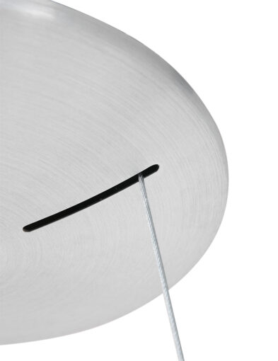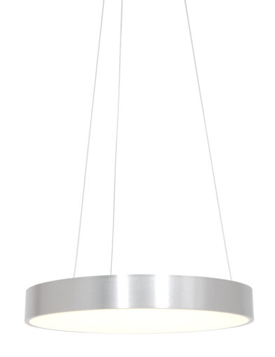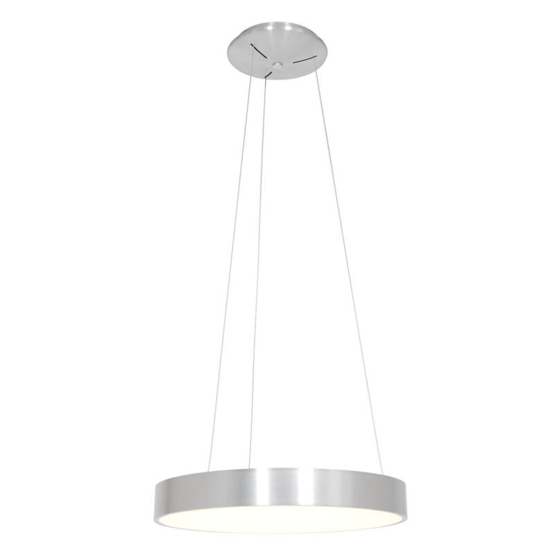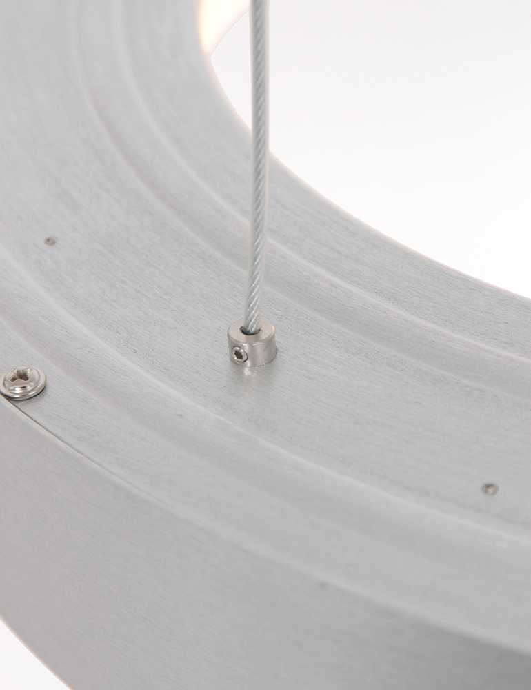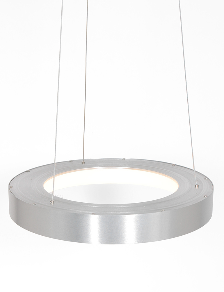 Minimalismus trifft Glamour bei dieser luftigen runden Ringlede Hängeleuchte. Ein ringförmiger Schirm und eine runde Deckenplatte aus chic gebürstetem Silbermetall. Sie sind durch drei filigrane, extrem starke Drähte in derselben Farbe mit pyramidenförmigem Silhouette verbunden. All dies kombiniert mit energieeffizientem und extern dimmbarem LED-Licht. In einem modernen Lichtinterieur über dem Esstisch strahlt diese silberfarbene Schönheit dich an.