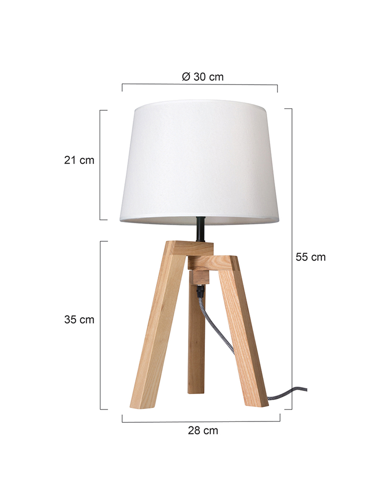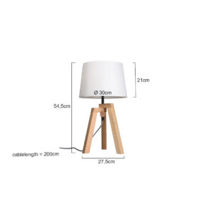 Ländliche Tischlampe mit Dreibein aus der Sabi-Serie, perfekt für eine natürliche und warme Ausstrahlung in deinem Interieur. Die Kombination aus einem Holzrahmen und einem weißen Textilschirm mit einem Durchmesser von 30 cm und einer Höhe von 21 cm sorgt für ein elegantes Gesamtbild. Geeignet für E27 Leuchtmittel bis 40 Watt und ausgestattet mit einem 195 cm langen Kabel mit einem Ein/Aus-Schalter. Zwei Jahre Herstellergarantie inklusive.