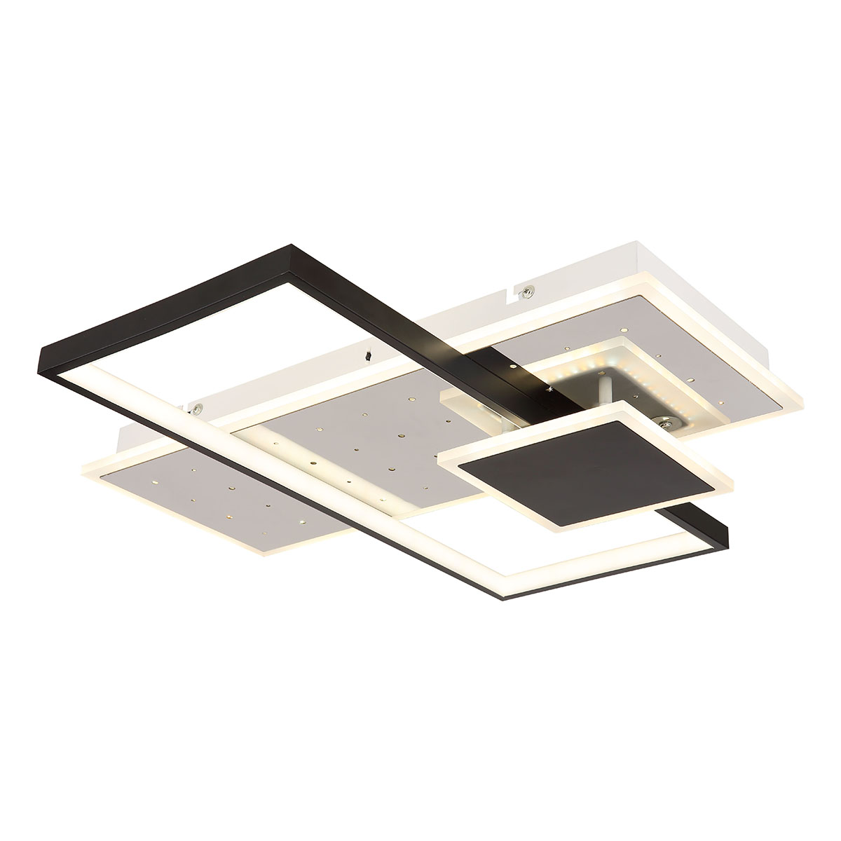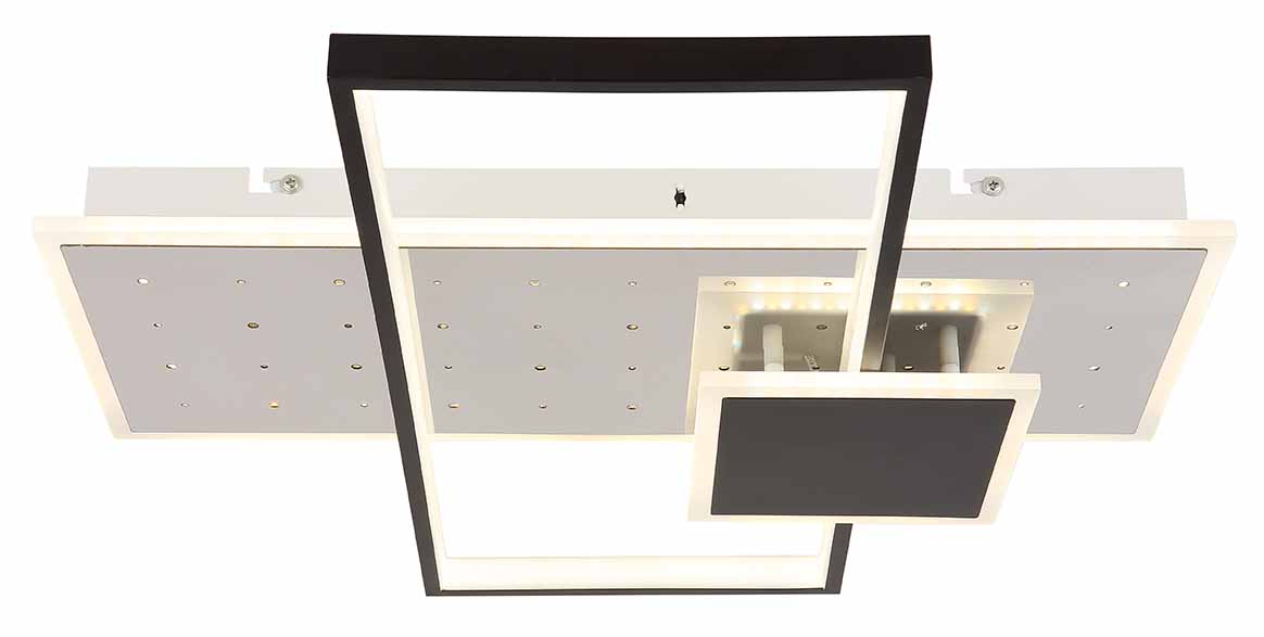 Beleuchte deinen Raum stilvoll und modern mit der DABBY quadratischen Deckenleuchte. Das schlichte architektonische Design, bestehend aus überlappenden Rechtecken und einem Quadrat, ist eine Kombination aus mattem Weiß und schwarzem Metallgehäuse, veredelt mit Chrom, schwarz-mattem Aluminium und opalen Acryldetails. Diese Lampe bietet fortschrittliche Funktionen wie dimmbare Helligkeit, Farbfixierung und eine Speicherfunktion, um die zuletzt gewählten Einstellungen beizubehalten. Ein eingebautes Nachtlicht sorgt für sanfte Beleuchtung, wenn nötig. Die DABBY verteilt das ideale Licht in mittelgroßen Räumen und ermöglicht es dir, die Lichttemperatur zwischen 2700K und 6500K anzupassen, sodass du die perfekt passende Beleuchtung für jeden Anlass schaffen kannst.