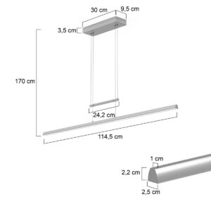 Bringen Sie moderne Eleganz in Ihr Interieur mit der stahlfarbenen Hängeleuchte aus der Profilo-Serie von Steinhauer. Diese stilvolle Hängeleuchte kombiniert ein klares Design mit funktionaler Beleuchtung und ist mit einem austauschbaren LED-Streifen von 16,8 Watt ausgestattet. Mit einer Lichtausbeute von 1700 Lumen genießen Sie sowohl stimmungsvolles warmes Gelblicht (2200 Kelvin) als auch hellweißes Licht (4000 Kelvin), perfekt für jede Umgebung. Dank der verstellbaren Höhe von 110 bis 170 cm und einer Länge von 114,5 cm passt diese Hängeleuchte mühelos über einen Esstisch oder eine Kochinsel.