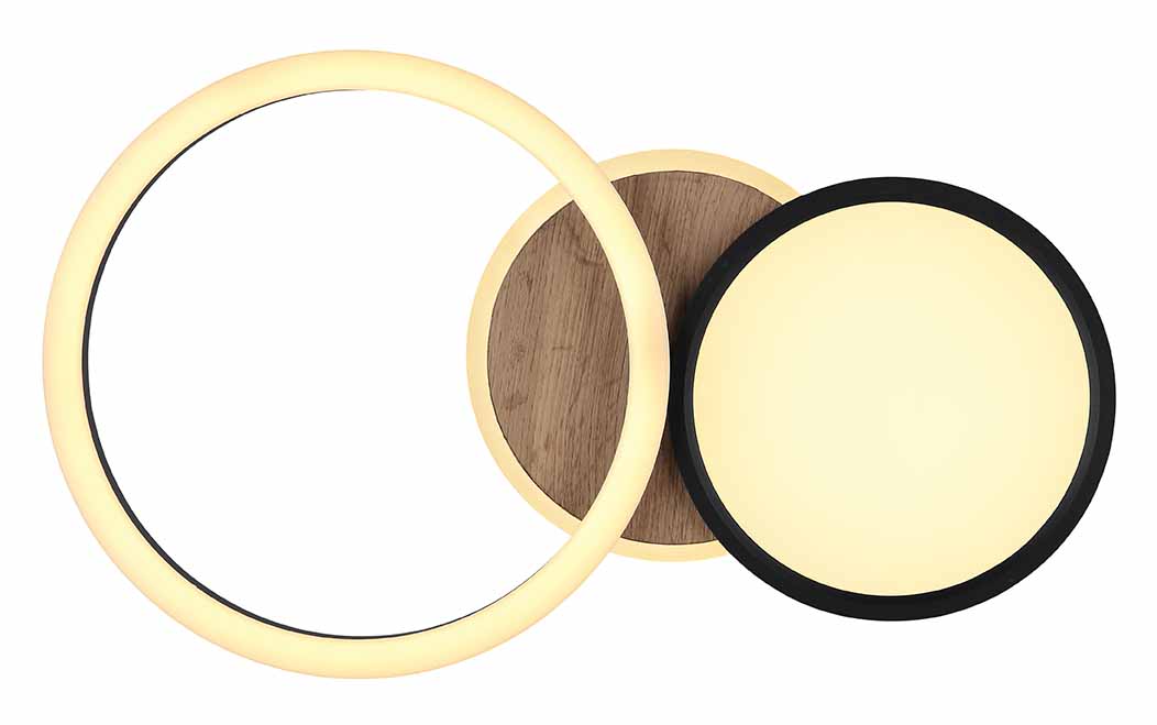 Verzaubern Sie andere mit der klaren Ästhetik dieser kompletten Lampe, kombiniert aus schwarzem Metall und raffiniertem MDF, das an schönes Holzwerk erinnert. Sorgfältig entworfen, enthält diese Deckenlampe sowohl einen Ring als auch ein kreisförmiges Panel, die zusammen einen wunderschönen visuellen Effekt erzeugen. Das Licht, das von den integrierten LED-Panels ausgeht, verbreitet ein warmweißes Licht von 3000 Kelvin und verleiht Ihrem Raum eine einladende Atmosphäre. Mit der zusätzlichen Funktion eines ausrichtbaren externen LED-Rings für optimales Licht kombiniert diese Lampe Innovation mit Eleganz, perfekt geeignet, um jeden Raum zu verschönern.