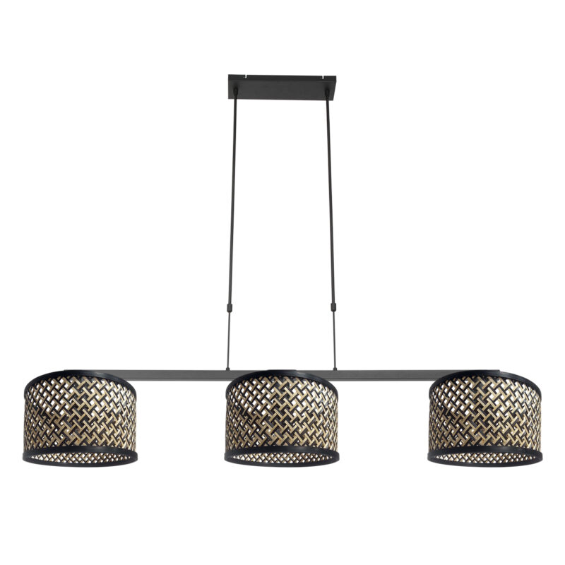 Schwarze Pendelleuchte mit drei Lichtern und Rattanschirm Steinhauer Stang