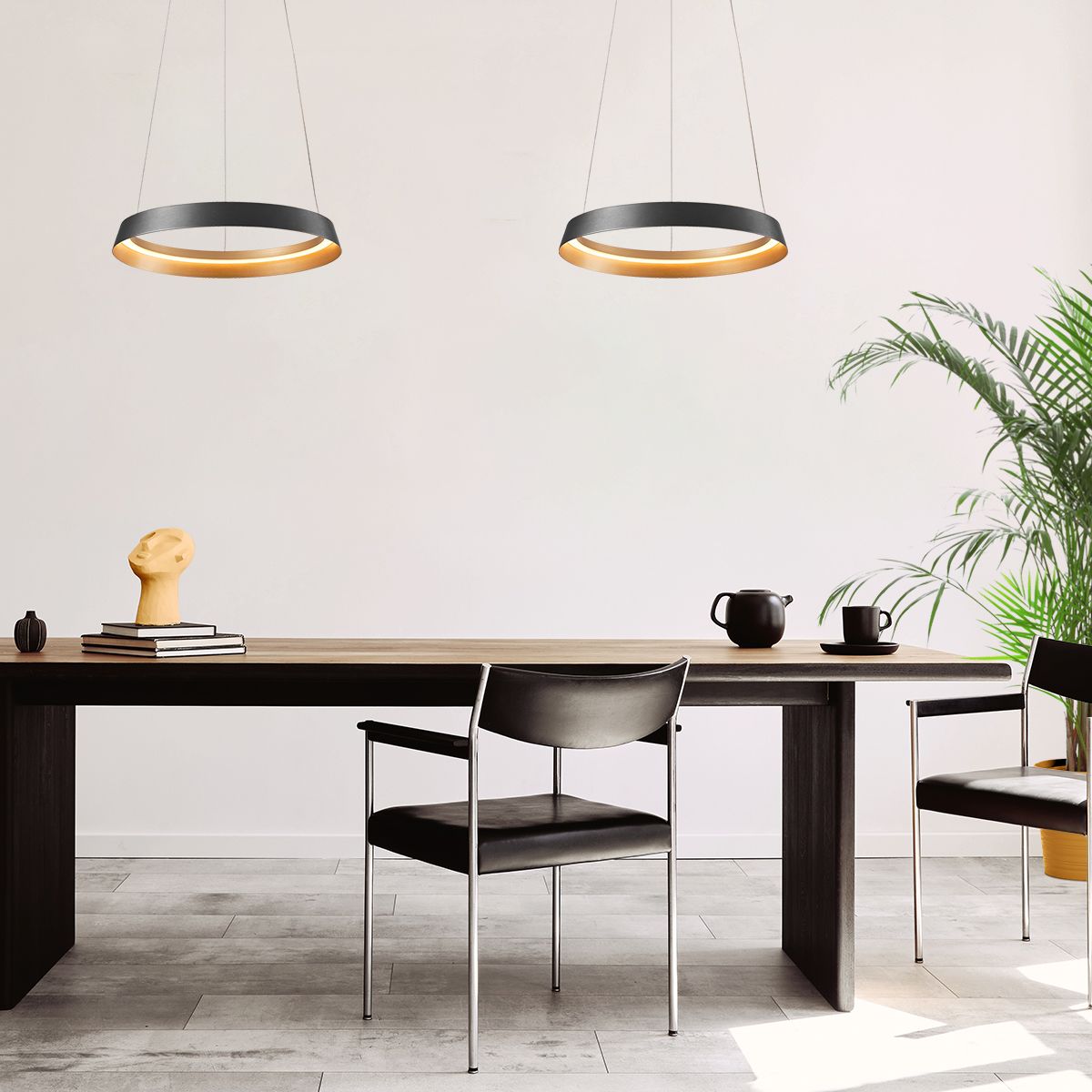 Die Steinhauer Ringlux Hängeleuchte ist eine stilvolle Ergänzung für modern eingerichtete Räume. Mit ihrem schlanken, schwarzen Ringdesign und der integrierten LED-Beleuchtung bringt diese Lampe eine minimalistische Ausstrahlung in Esszimmer und Arbeitsbereiche. Die robuste Metallkonstruktion gewährleistet Langlebigkeit, während das dimmbare LED-Modul energieeffiziente Beleuchtung mit einer warmen Lichtfarbe von 2700 Kelvin bietet.