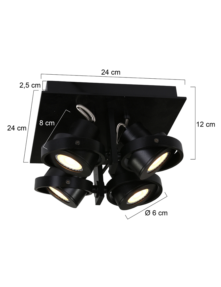 Verstellbare 4-Licht schwarze Spot aus der Quatro-Serie, ideal für moderne und industrielle Interieurs. Dieser Aufbau-Spot ist sowohl drehbar als auch schwenkbar, sodass du die Beleuchtung perfekt ausrichten kannst. Geeignet für die Montage an Wand oder Decke und ausgestattet mit vier energieeffizienten 7 Watt LED-Lampen. Mit seinem klaren schwarzen Design fügt er sich mühelos ins Wohnzimmer, in die Küche, den Flur oder das Büro ein. Darüber hinaus ist dieser Spot für das Badezimmer in Zone 3 geeignet.