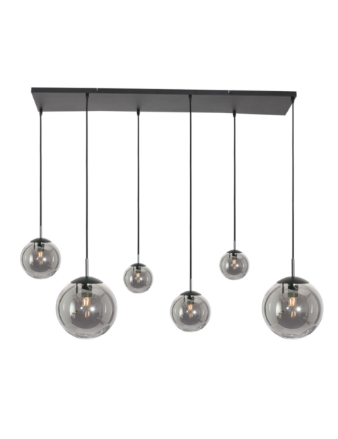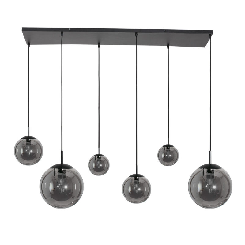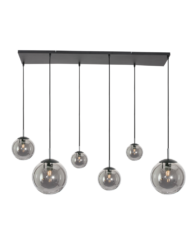 Die Bollique Pendelleuchte mit sechs smoke mirror Glaskugeln kombiniert modernes Design mit einer luxuriösen Ausstrahlung. Die variierenden Größen sorgen für einen spielerischen Effekt, während der schwarze Deckenbalken und das Eisenkabel einen strengen Kontrast bilden. Dank der E27-Fassungen haben Sie Wahlfreiheit bei den Lichtquellen, so dass Sie mühelos die gewünschte Atmosphäre schaffen können. Mit der einstellbaren Höhe ist diese Lampe ideal für verschiedene Räume. Diese Pendelleuchte der Marke Steinhauer wird mit 2 Jahren Garantie geliefert.